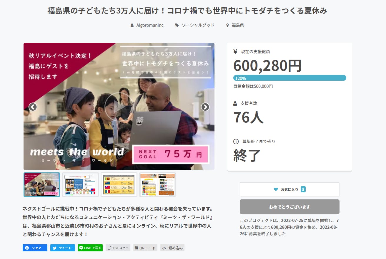 【支援金額:600,280円/支援者数:76名様】という成果が生まれました。