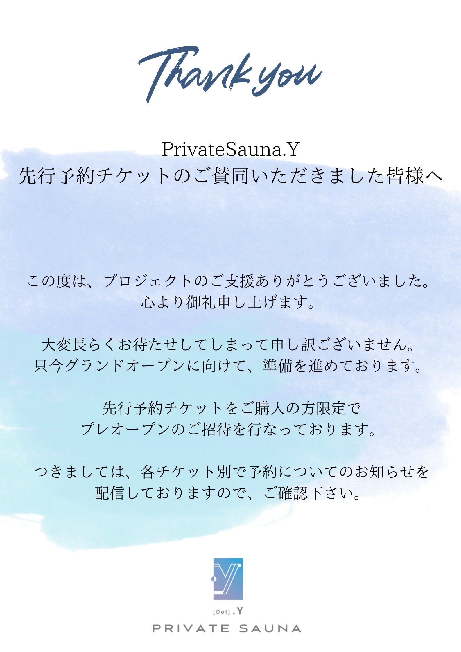 2022/09/11 15:17この度、ご支援いただいた皆様にはサンクスレターを送らせていただきました。オープンに向けてInstagramなどSNSでも詳細等投稿していきますので、是非そちらもご覧ください。PrivateSauna.Y 公式Instagramhttps://www.instagram.com/private_sauna.yPrivateSauna.Y 公式LINEhttps://lin.ee/avxTwxj もっと見る