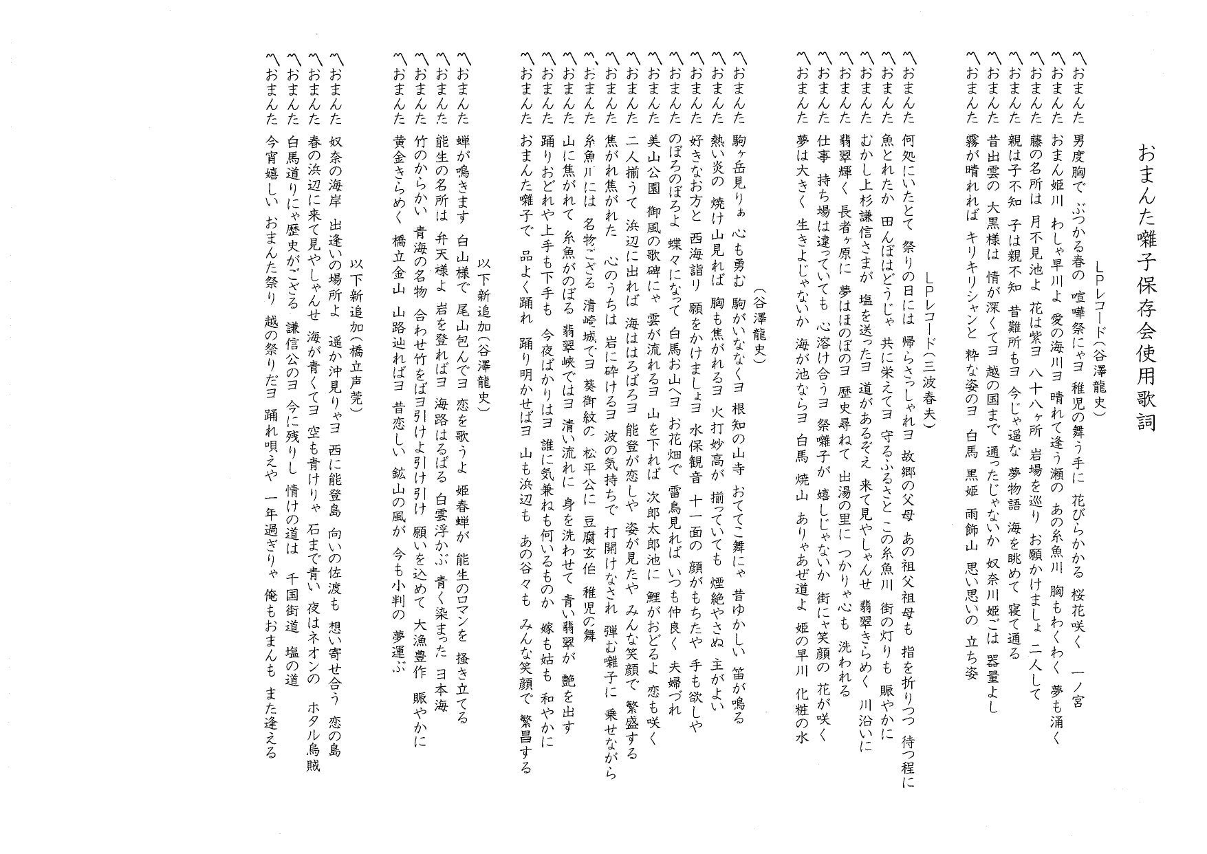 知ってますか??糸魚川おまんた囃子の歌詞って全31番まであって糸魚川の各地みどころをあまねく唄った歌なんです!!。そんな『糸魚川おまんた囃子』の歌詞を片手に、故郷を歩いてみるのもきっとまた一興ですよ・・・