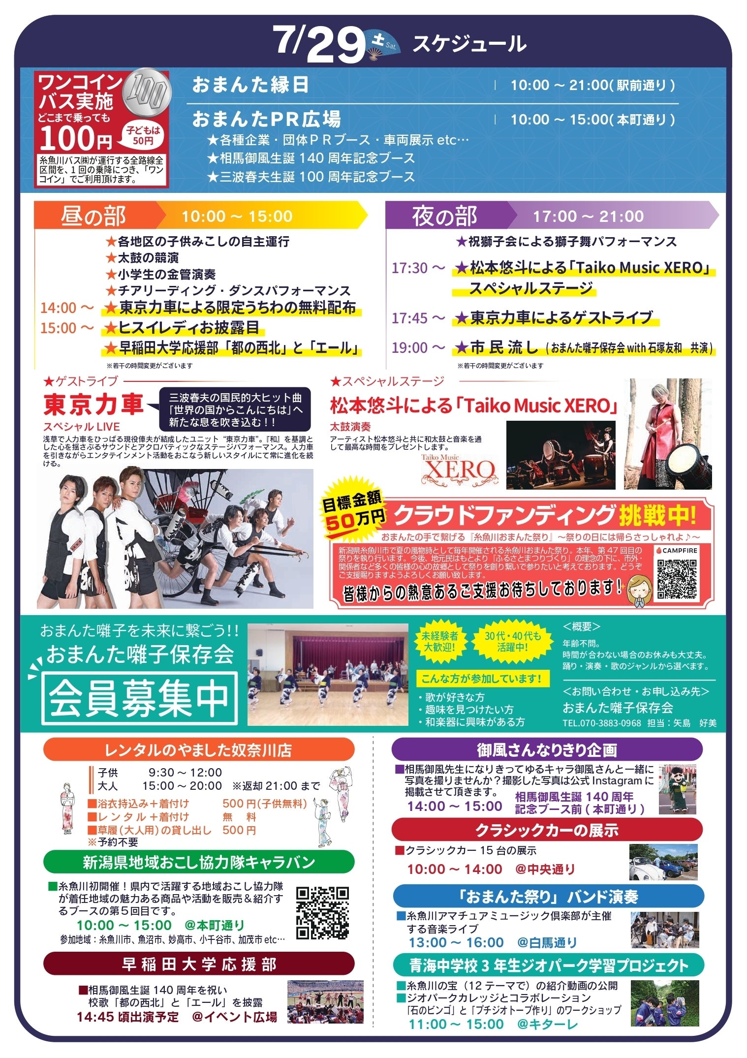 2023/07/15 15:00皆様、熱意あるご支援ありがとうございます。お祭り当日まで14日となりました。第47回糸魚川おまんた祭りついに当日のスケジュール解禁です! 今年のテーマはふるさと糸魚川から~100年繋がる広がるおまんたの輪~糸魚川、おまんた祭りにゆかりある・相馬御風生誕140周年・三波春夫生誕100周年そこから繋がる輪とご縁・東京力車2年連続出演!・早稲田大学応援部のエール・都の西北糸魚川の夏は市民が盛り上げる・各種イベントや縁日の出店・PRブースも今年から拡大開催・市内の中学生による学びの発表・地元出身アーティストによるSPステージおまんた祭りの為なら一肌脱ぐZ・レンタルのやましたの無料着付け・新潟県の地域おこし協力隊が集結!・中央通りはクラシックカーの展示・白馬通りでは音楽ライブ・キターレは前面お休処に お祭り当日は10時~21時まで思う存分、糸魚川の夏をお楽しみください! もっと見る