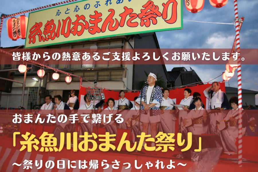 本年度の祭りスローガン『ふるさと糸魚川から~100年繋がる広がるおまんたの輪~』の下に、多くの皆さまの夢を叶える場、多くの皆様の心のふるさととして、年十年何百年先まで未来永劫繋がって広がっていく、糸魚川おまんた祭り・おまんたの輪を共に創り上げて参りましょう!!