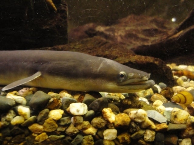 成魚は全長1m、最大で1.3mほどになり、細長い体形で体の断面は円形、眼は丸く口が大きいのが特徴です。
