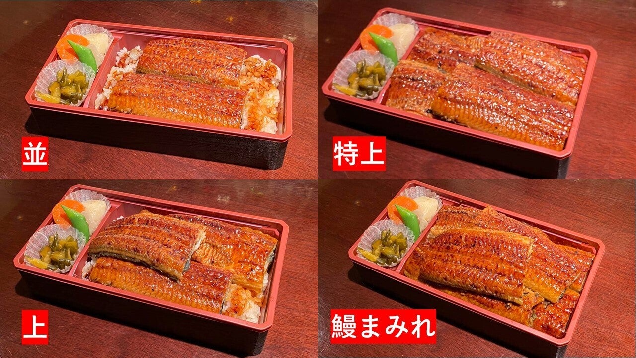 サイズは、「並」うなぎ2切れ、「上」うなぎ3切れ、「特上」うなぎ4切れ、「鰻まみれ」丸々1匹の4種類です。