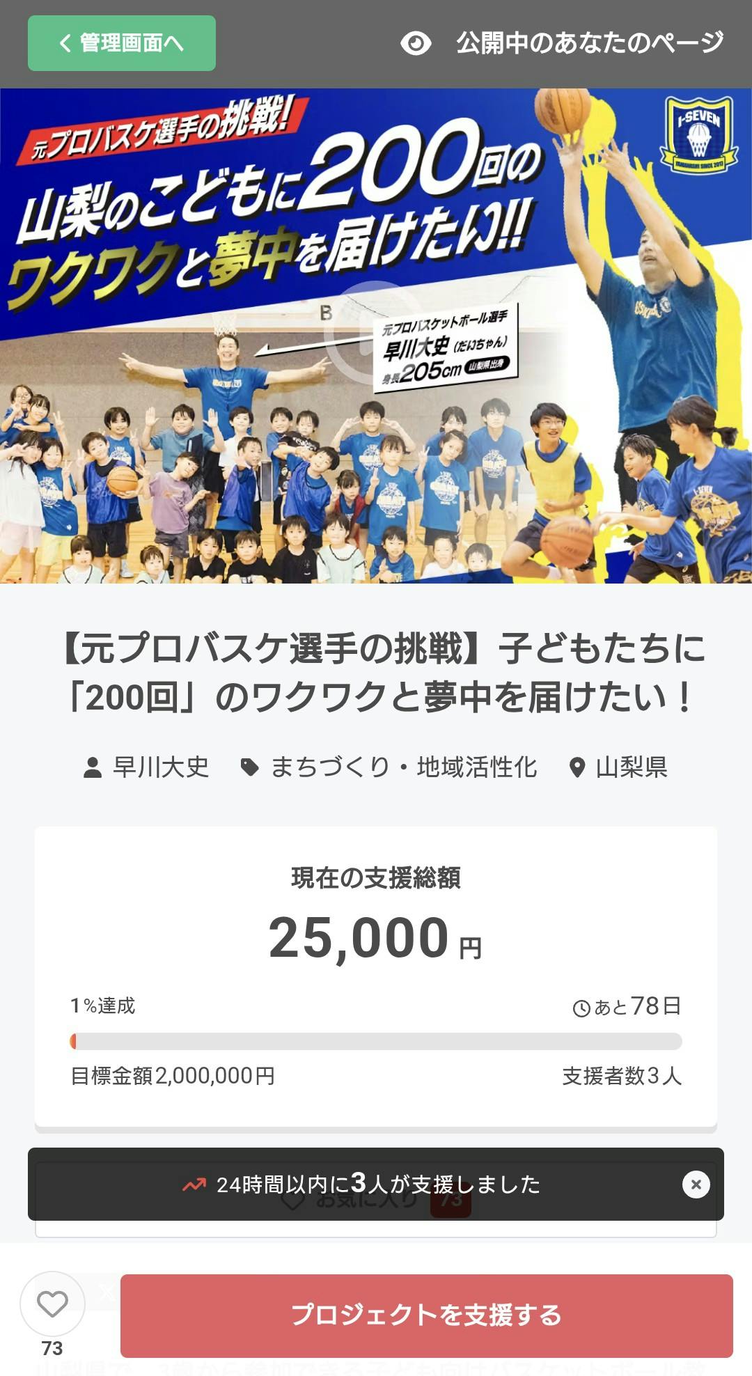 2026/02/04 16:47過去にプロジェクトをご支援いただいた大切な皆様、今回の新プロジェクトの支援者の皆様と開始前からお気に入り登録をしてくださっている皆様、こんにちは。子どものためのクラウドファンディング・プロジェクトオーナー、トルネードアカデミー 山梨アイセブンの早川大史(だいちゃん)と申します。以前、私の4回のクラファンプロジェクトへ子どもたちのために温かいご支援をいただき、本当にありがとうございました。皆様のおかげで実現した「あの時のイベント」や「あの時の活動」の笑顔は、今も僕の宝物です。そして今のアイセブンがあるのは、皆様のお陰です。昨日、ついに私の人生史上最大のチャレンジとなるクラファンを公開いたしました!そして、公開からまだ1日経っていないにも関わらず、すでに「3名」の方から温かいご支援をいただいております。真っ先に駆けつけてくださった皆様、本当に、本当にありがとうございます!!また、「73名」もの方が公開前から『お気に入り登録』をしてくださっており、これだけ多くの方が注目してくださっていることに、身が引き締まる思いです。(これまでの最高お気に入り登録数は、2021年の第2段プロジェクト《親子で参加して楽しめる無料のバスケ体験イベントを残したい!》の時でした。今回の73名はCAMPFIRE全体としても、開始前登録者数が全世界で7位を記録しました!ご登録いただいた皆様、ありがとうございます!)今回のプロジェクトのテーマは『山梨の子どもたちに「200回」のワクワクと夢中を届けたい!』山梨県内の保育園や幼稚園やこども園へ無料でバスケや運動遊びを届ける出張事業(通称・アイセブンキャンバス)を、年間200回開催するためのチャレンジです。「予算がないから呼べない」「遠い地域だから来てもらえない」そんな壁をなくし、どんな子にもボールに触れて「できた!」と目が輝く成功体験の瞬間を届けたい。その一心で、2年以上の時間をかけて、丁寧に準備してきました。※今回のプロジェクトページ制作にあたり、粘り強く伴走してくださっているデザインギルド「CLICK(クリック)」の皆さん、篠 鉄平さん(プロジェクトページにも激励のメッセージをいただいております)、楢畑さん、野呂瀬さん、廣瀬さん、田中さん、そしてきっかけをくださった山梨大学の澤 伸恭先生(同じくプロジェクトページにも激励のメッセージをいただいております)、やまなしクラウドファンディング学生サポートの皆さん、僕の想いを形にするために長期間お力を貸していただき、本当にありがとうございます!!今回の挑戦は、僕自身の夢というより、これからの山梨や日本や世界を担う「子どもたち」のための挑戦です。ここから約2ヶ月間、山梨の子どもたちの未来のために全力で走り抜けます。どうか、最後まで熱い応援をよろしくお願いいたします!▼ プロジェクトページはこちら(まだ読んでいない方は、ぜひ一度想いに触れてください!)https://camp-fire.jp/projects/831549/view【参考映像:アイセブンキャンバスの様子】 (協力/クラファンページ・動画制作、デザインギルド「CLICK(クリック)」)皆さまの想いが未来を創ります。想いは届く、夢は叶う。Enjoy your Life.Enjoy your Basketball.—————————————【以下、インフォメーション】■ 体験参加・お問い合わせ 興味のある方は、HP問い合わせフォーム、または各種SNSのDMからご連絡ください。@yamanashiiseven■ アイセブンスポンサー様 スポンサーパートナーの皆さま、いつもありがとうございます。 現在 32名(社)様 に増えました。皆様のお陰で活動ができております。医療法人ワコウ・富士見歯科診療所 様 / JUNKOMITSUMORI 様 / ピースライフ山梨・スローライフ山梨 様 / 株式会社ブリッジ 様 / 山武造船株式会社 様 / 有限会社エクステリア中川 様 / やまなみテクノロジーズ株式会社 様 / 依田貴石 様 / 炭火焼肉 野・野 様 / 体験型フリースクール みんなのおうち 様 / 社会福祉法人宮前福祉会 つつじが崎学園 様 / ローソン山梨一宮末木店 様 / 柳井電機工業株式会社 様 / 若尾会計事務所 様 / 合同会社キッズサポート・放課後等デイサービス・児童発達支援キッズサポート・就労支援事業所りんく 様 / セブンイレブン山梨一宮中央店 様 / 社会福祉法人宮前福祉会 宮前こども園 様 / まなぶ鍼灸整骨院 様 / 有限会社浅子商店 様 / バスケファンオヤジと大学生 様 / のん(カメラのひと) 様 / 山本剛士 様 / 山北 様 / 甲州地どりラーメン専門店 鶏そばAkari 様 / 前田友和 様 / 藤巻素純 様 / 白川豊 様 / 谷原 様 / 桑原 様アイセブンホームページのスポンサー様の欄にもお名前を掲載させていただいております。https://www.yamanashiiseven.com—————————————体育館を建てる男 / バスケットボールの先生 早川 大史 (DAISHI HAYAKAWA)・一般社団法人 山梨アイセブン / トルネードアカデミー 山梨アイセブン / 山梨アイセブン スポーツ少年団・アイセブンキャンバス(出張バスケットボール事業) / 山梨県バスケットボー