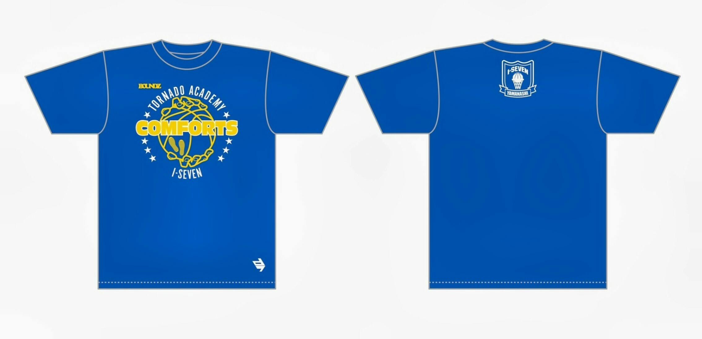 今シーズンの青色のアイセブンTシャツ、こちらはトルネードアカデミーTシャツの山梨アイセブン限定バージョンとなっています。