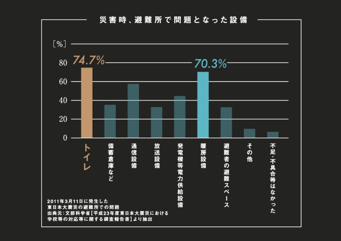 文部科学省の発表するデータによると、トイレは災害時避難所で最も問題になった設備でもあり、衛生環境の悪化により死に直結したケースもあります。※新潟中越地震の場合、死者60人のうち半数近くが関連死と言われてます。