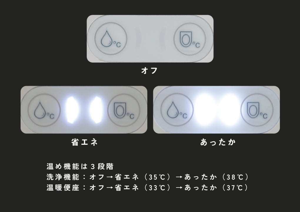 『Kirei PLUS』は水圧のみで洗浄機能が使えるため、暖かい時期など温水・温暖便座を使わない時は機能をオフ。