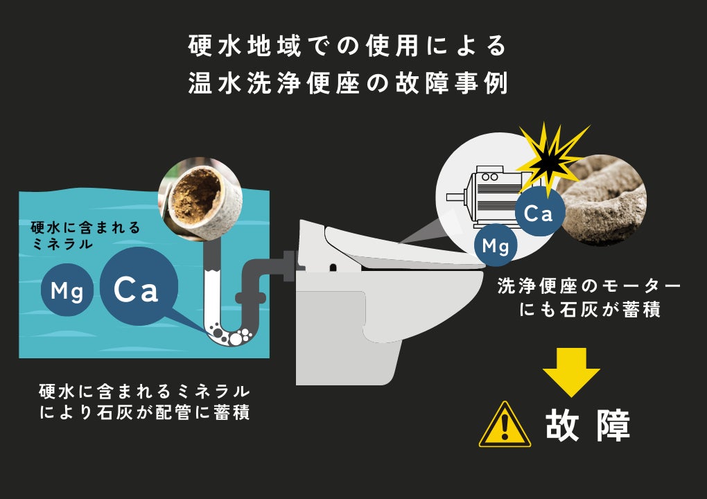 日本国内の大半の地域は軟水です。しかし、一部硬水(井戸水)地域で従来の温水洗浄便座を使用すると、硬水に含まれるミネラル物質により、給水管や便座のモーター部分に石灰が蓄積し、数年で故障してしまうケースがあります。