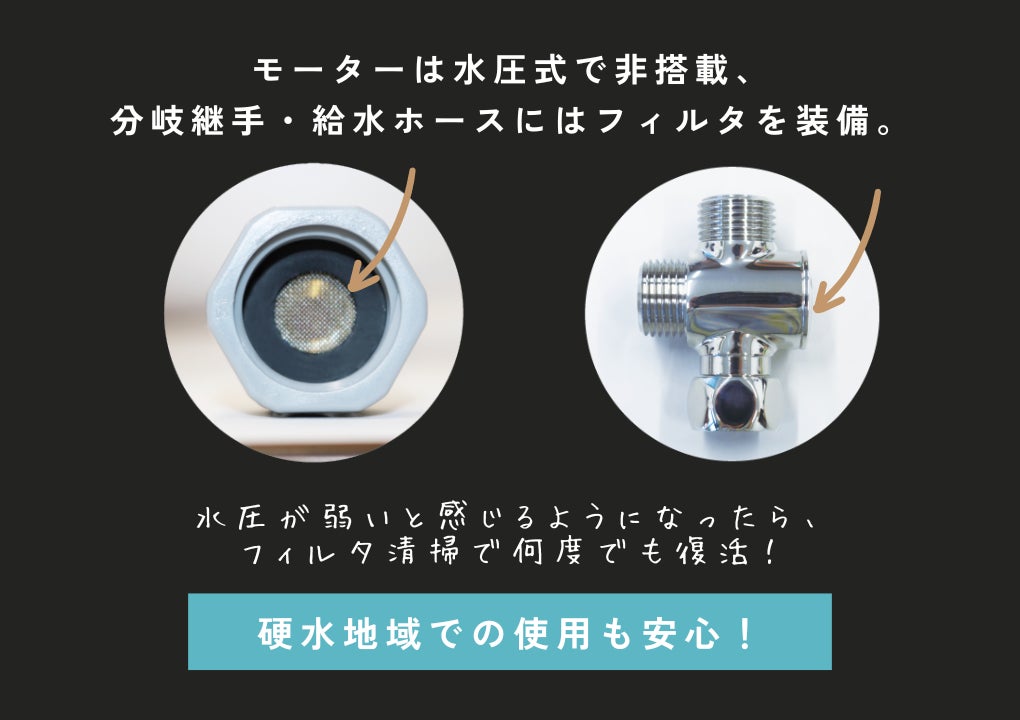 しかし、『Kirei シリーズ』共通特徴でもある、分岐継手と給水ホースに搭載されているフィルタの効果により、今まで故障のしやすかった硬水地域や井戸水でも問題なく使用ができます。