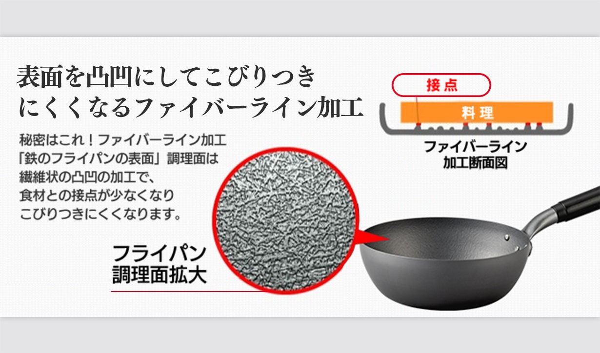 窒化鉄の調理面には、繊維状の凹凸加工(ファイバーライン)を施す事で、油の馴染みが良く、また食材との接点を少なくすることで、こびり付きにくくなります。