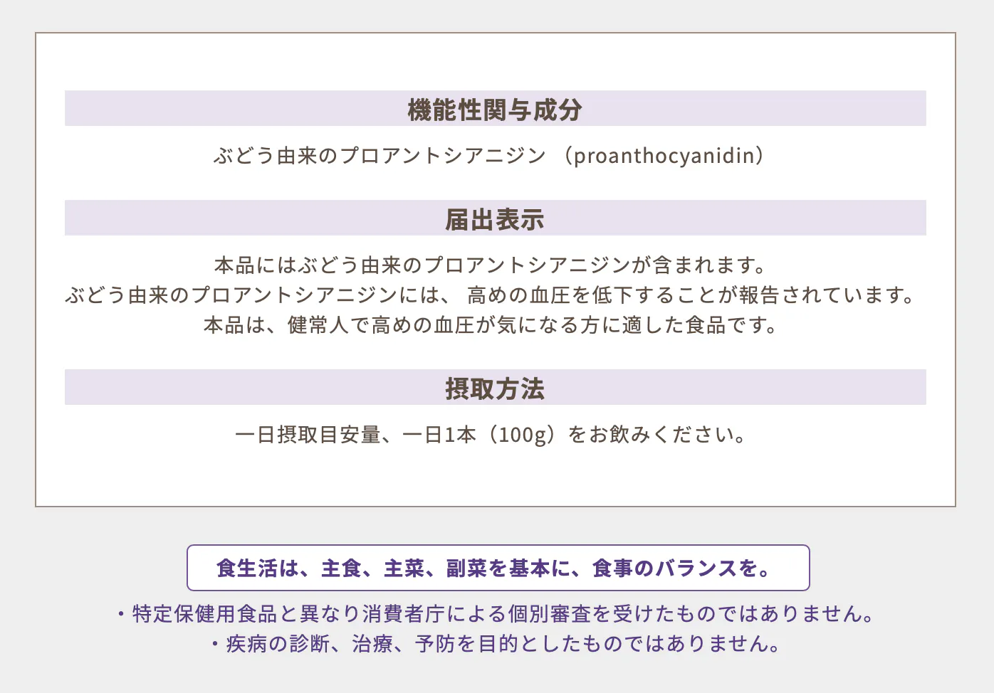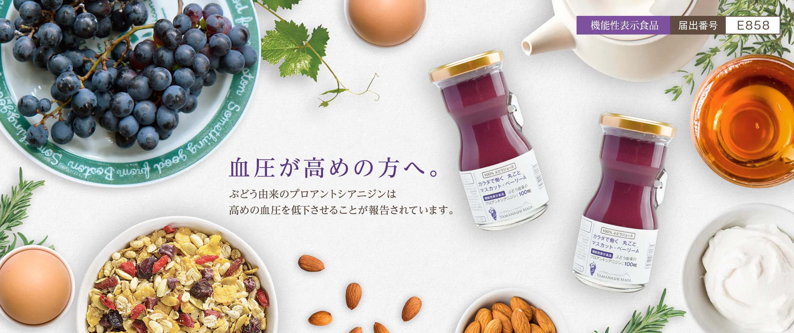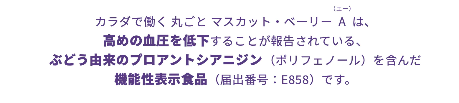 「カラダで働く 丸ごと マスカット・ベーリーA(エー)」は、機能性表示食品(届出番号:E858)です。本品にはぶどう由来のプロアントシアニジンが含まれ、ぶどう由来のプロアントシアニジンは高めの血圧を低下することが報告されています!そのため本品は、健常人で高めの血圧が気になる方に適した食品です。