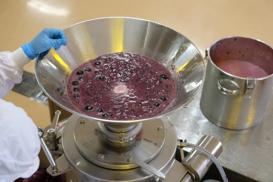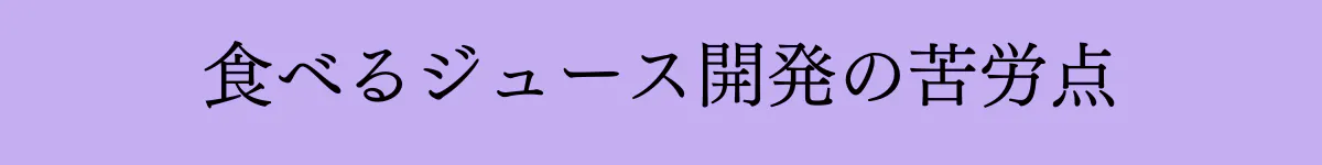 食べるジュースの開発の苦労したところは種と皮のつぶれ具合です。あまりにつぶすとさらさらになりすぎ、かといって、種と皮の食感が残っていても商品になりません。ちょうどいい食感を出すのに苦労しました。