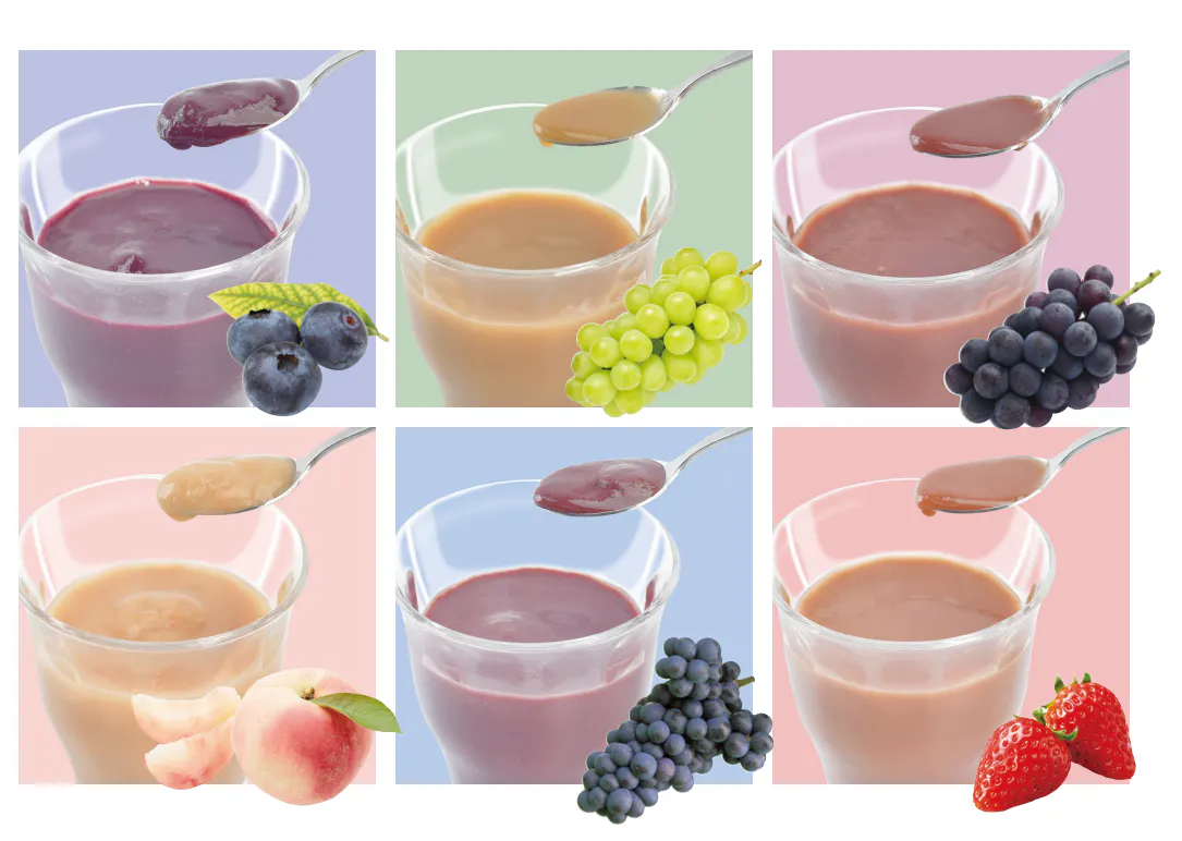 この食べるジュースは現在「カラダで働く 丸ごと マスカット・ベーリーA(エー)」「食べるぶどうジュース『巨峰』」「食べるぶどうジュース『シャインマスカット』」「食べるいちごジュース」「食べるももジュース」「食べるブルーベリージュース」の6種類があります。