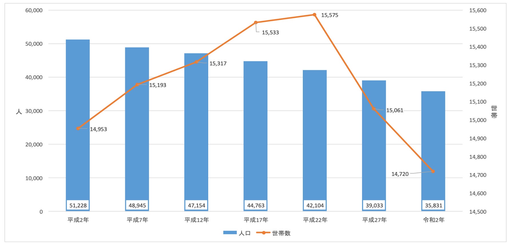 南房総市の人口推移(出典:国勢調査、南房総市総務部企画財政課「データで見る南房総」)