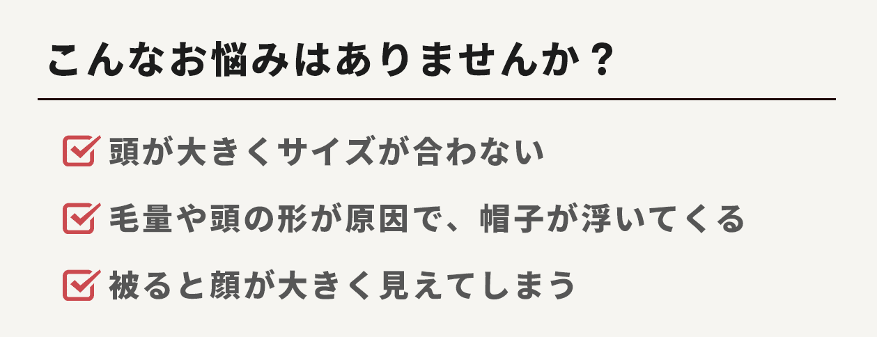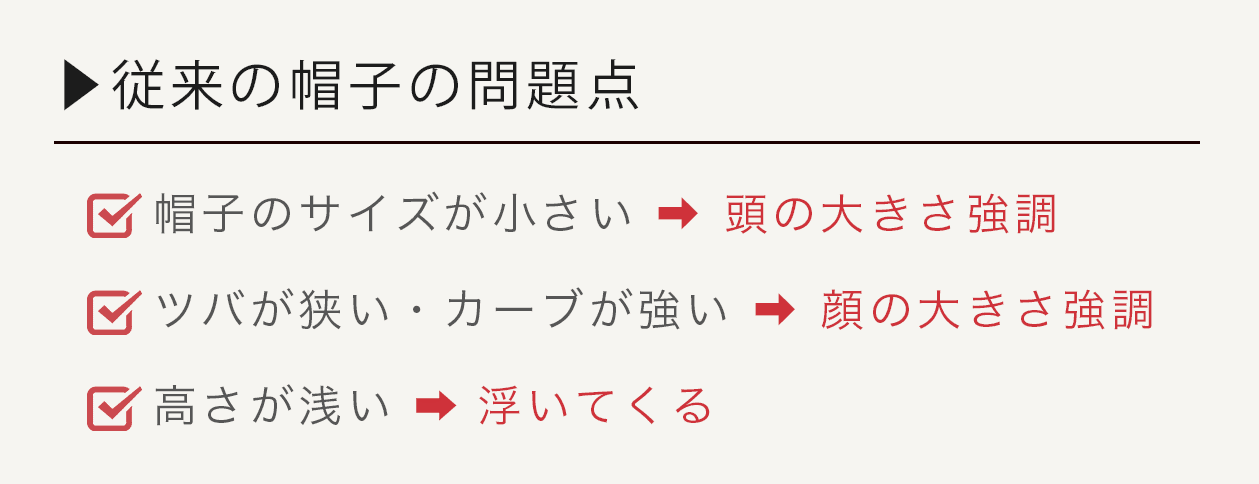 帽子が浮いてきてしまったり、小さい帽子を被ると顔が大きく見えてしまうという問題に悩まされていました。