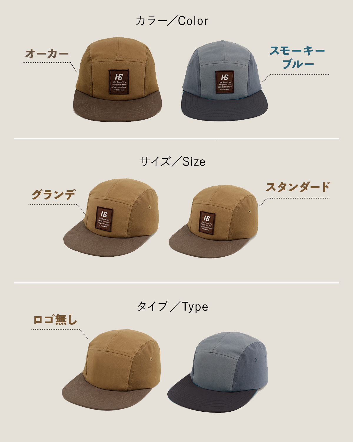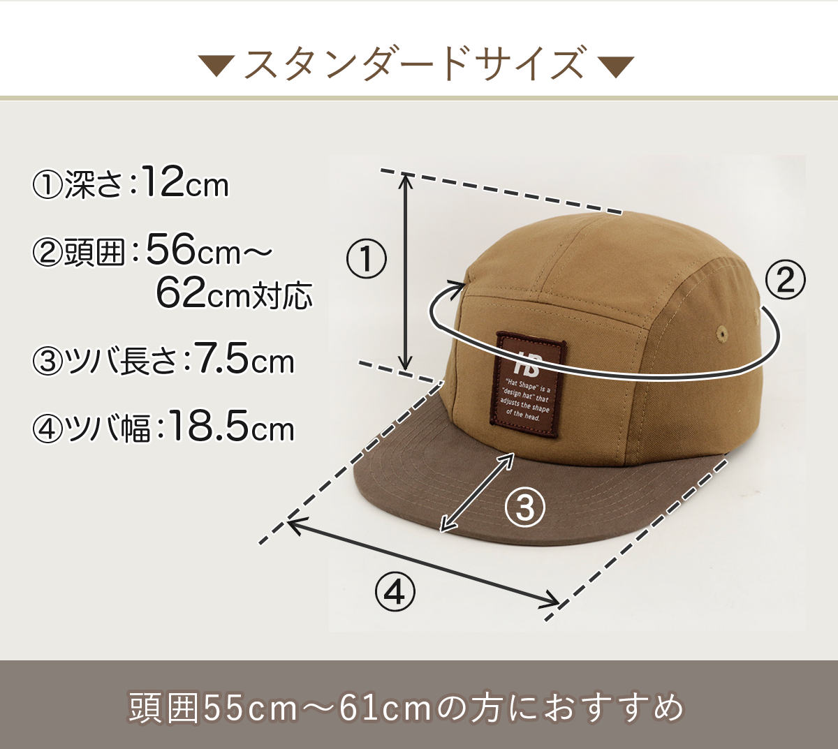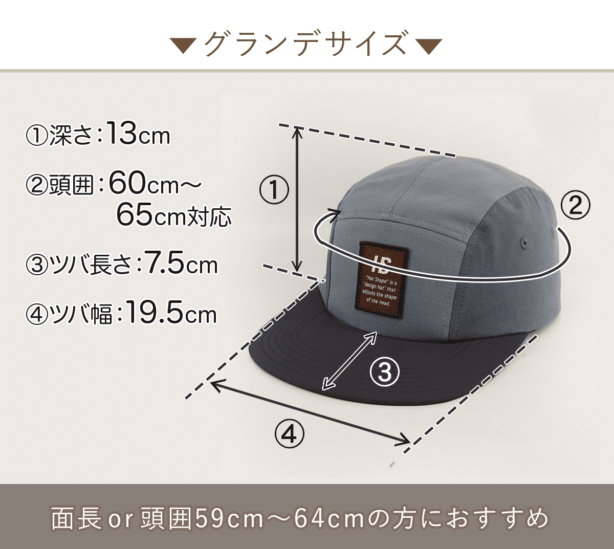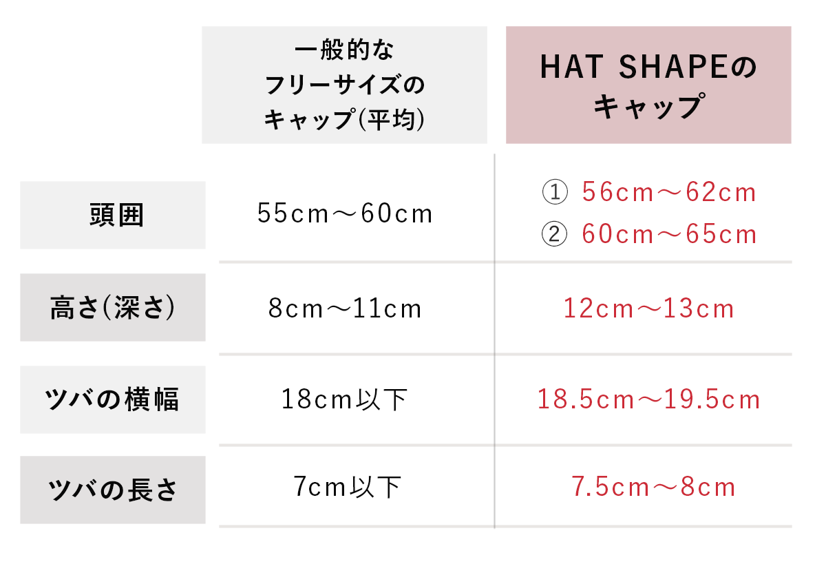 HAT SHAPEのキャップでは、①頭囲60cm〜65cm(グランデサイズ)、②頭囲56cm〜62cm(スタンダードサイズ)の2サイズからお選びいただけます。