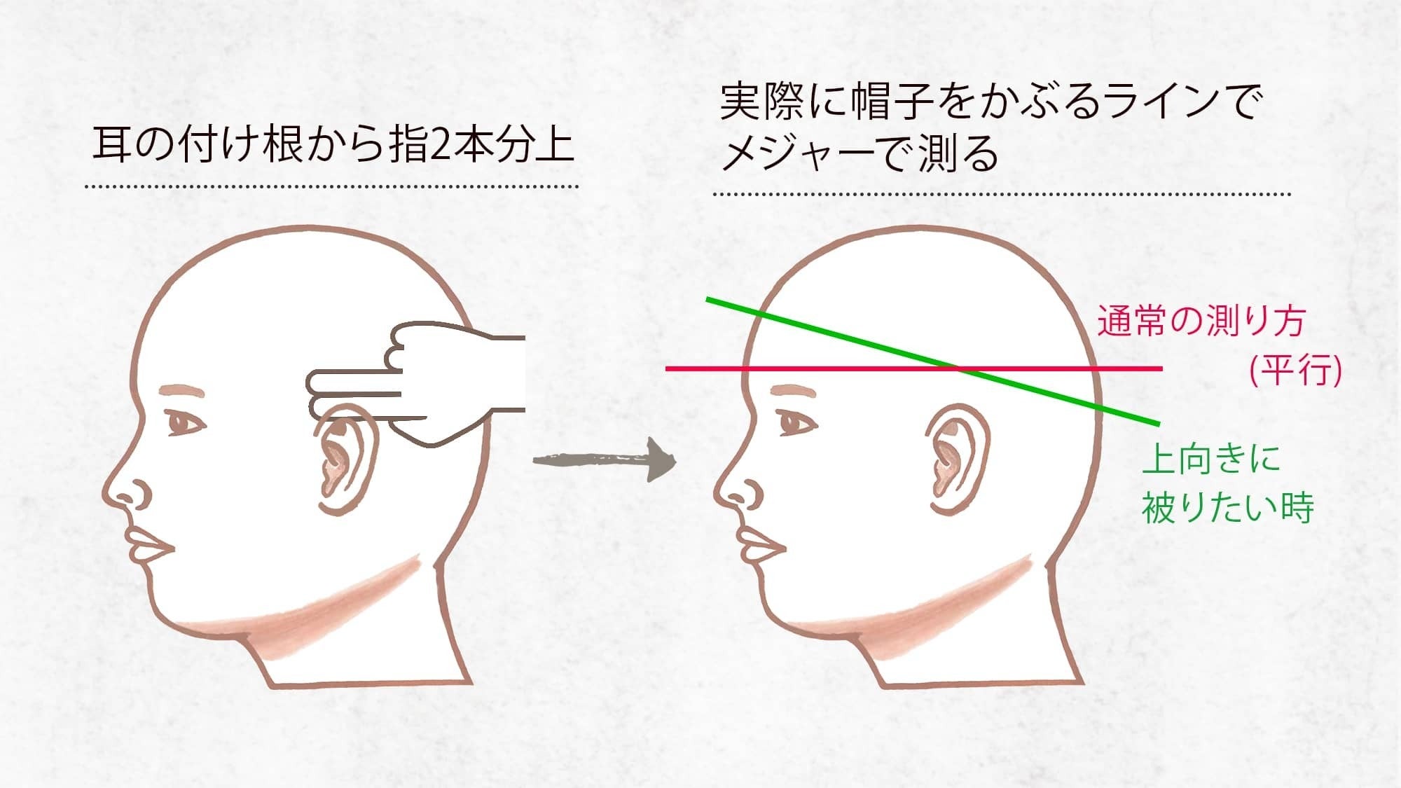 帽子のサイズは、自身の頭囲に+1cm〜2cm足した数字が自分に合ったサイズになります。