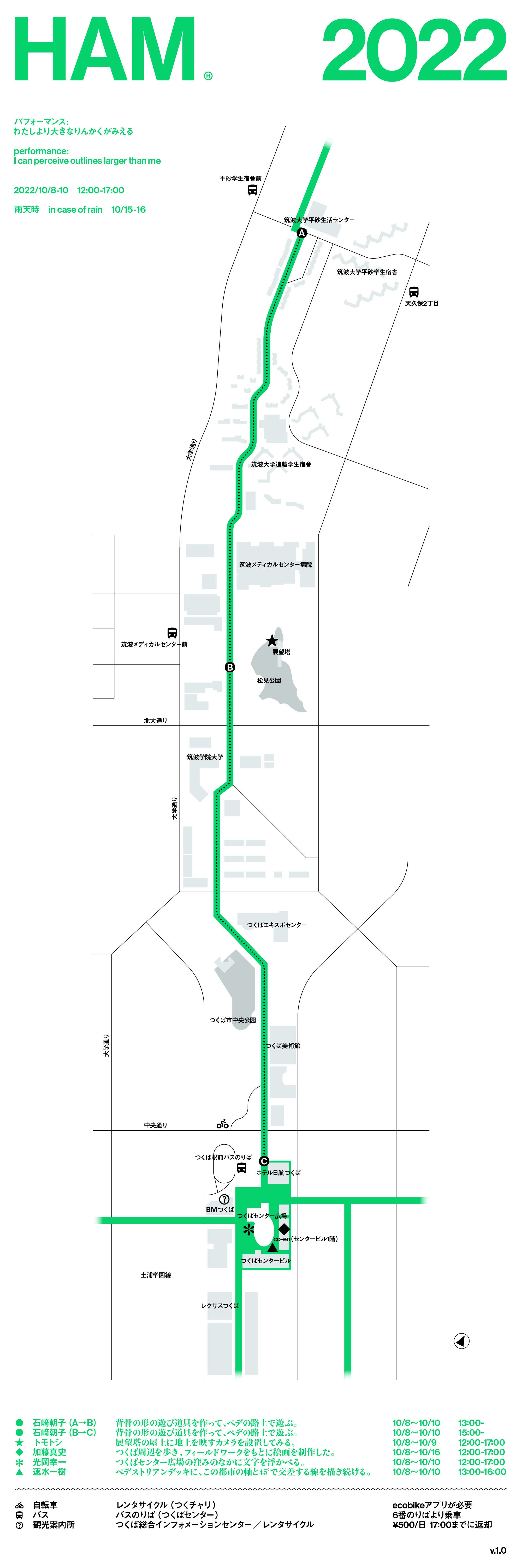 HAM2022は、つくばの「公共空間の存在が都市の成立に深く関係している」という特徴を利用して、「都市の仕組み」と「公共」について考える機会をつくるプロジェクトです。去年の10月から、約1年間にわたって活動をしています。