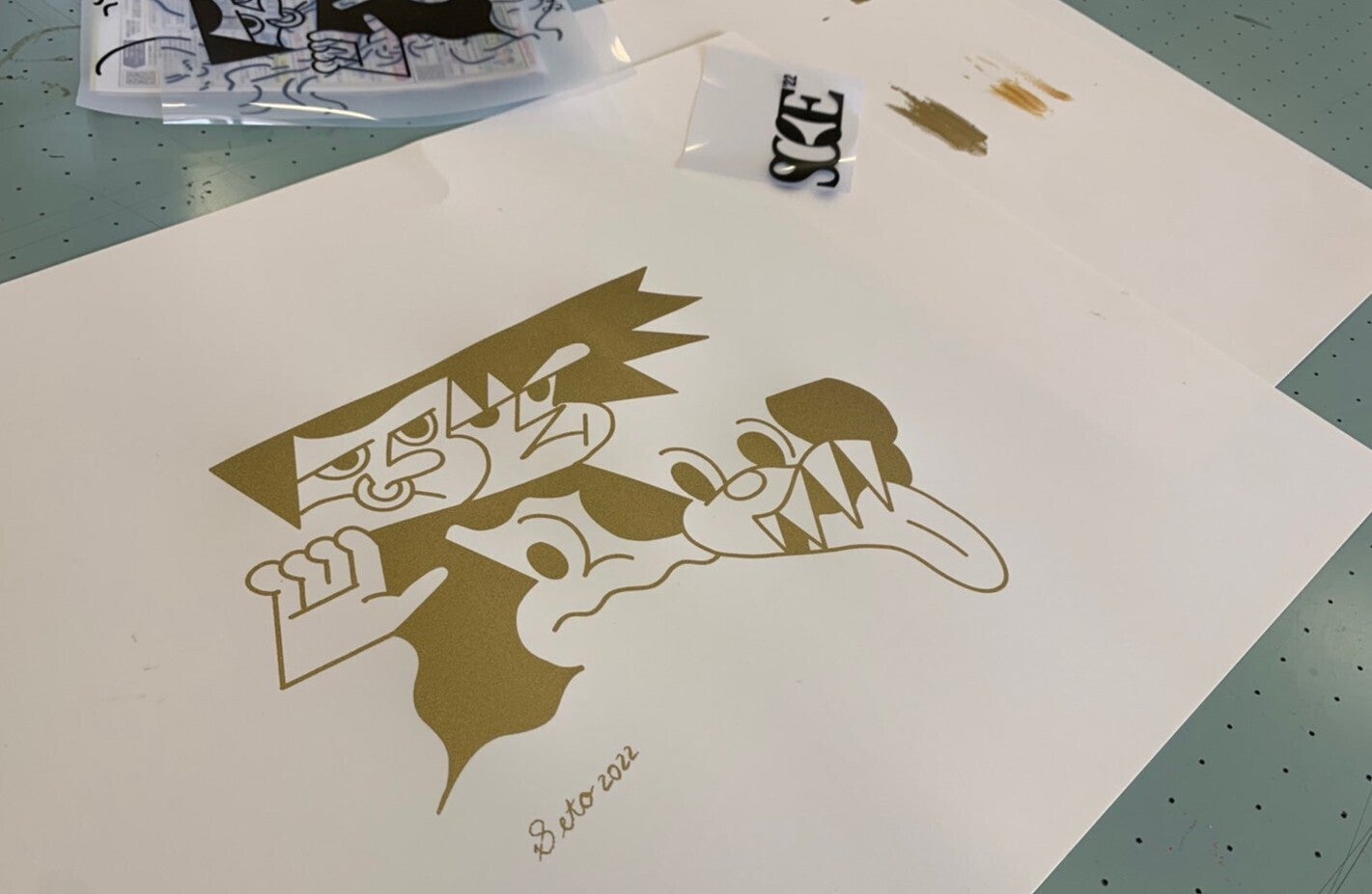 支持体にダイレクトに触れていく作風をそのまま活かし、シルクスクリーンの版そのものに直接描いてできたこの展覧会だけのオリジナルになります。