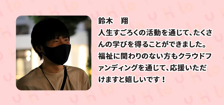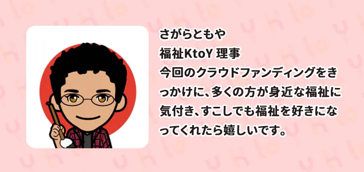 私たちは、誰にとっても福祉が身近になれば、一人でも多くの方の生きづらさを減らし、誰もが安心していきいきと暮らせる社会が実現できると信じています。そんな社会をつくるためには、このページを読んでいただいている皆様お一人お一人の力が必要不可欠です。どうかあなたの大切な方にこのプロジェクトが届きますように、ご支援、SNSでのシェア等、ご協力をよろしくお願いいたします。