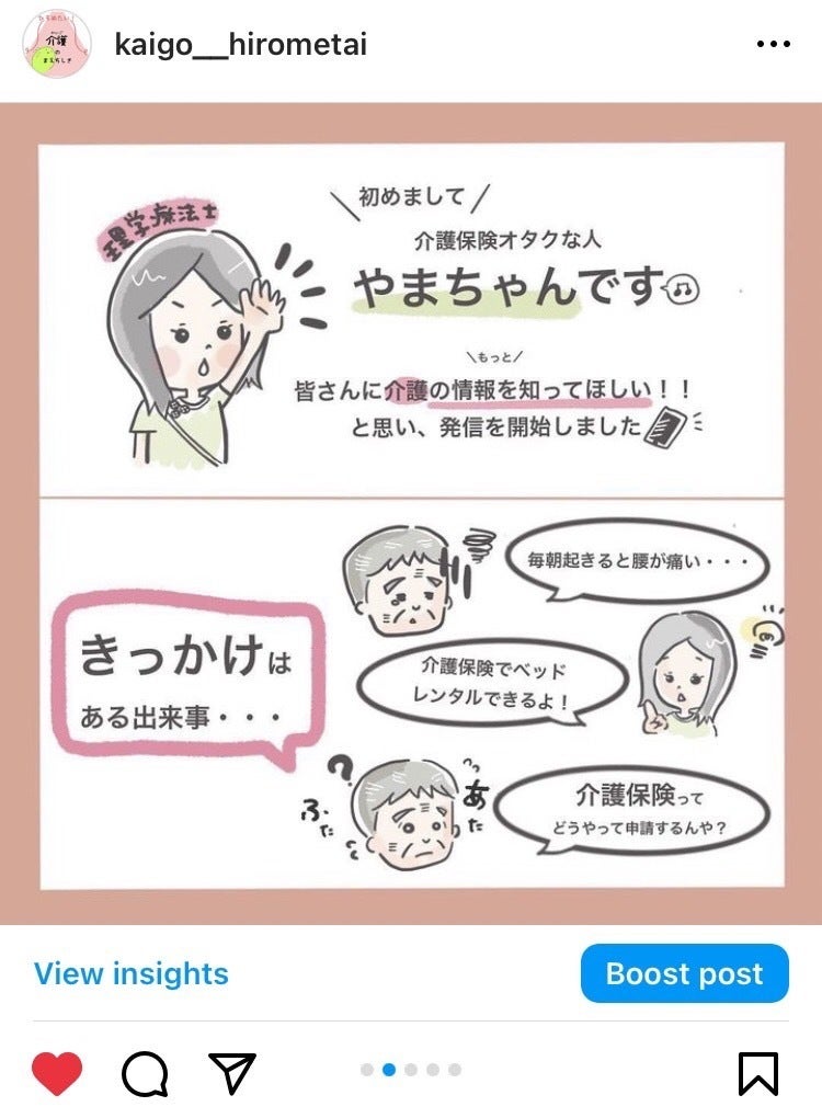 こんにちは。やまさきくみかという者です。職業は理学療法士ですが、自称『介護保険オタク』でもあり、日々インスタグラムなど介護にまつわる情報を発信しています!^^