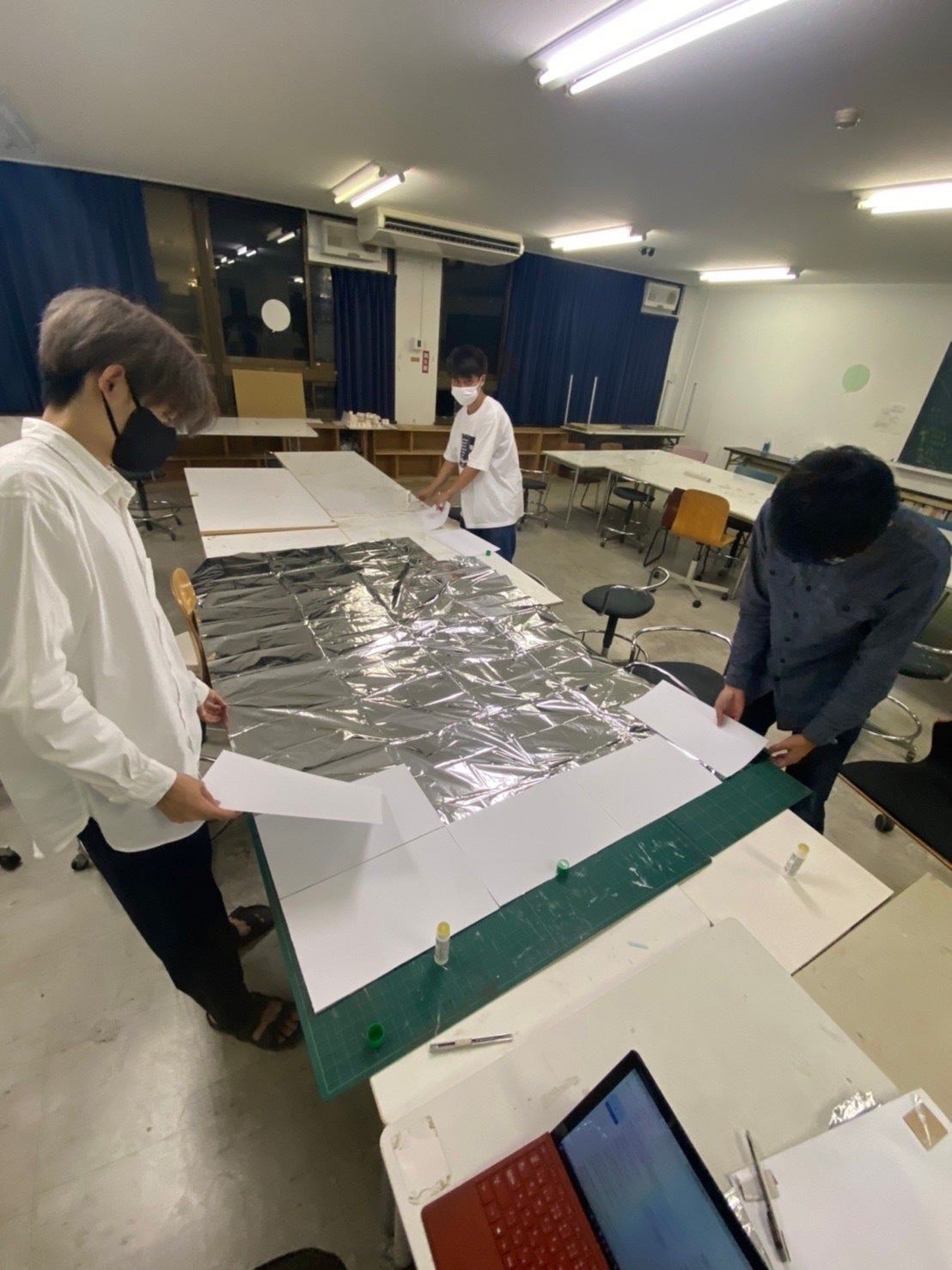 本日、高架下班で活動しました!夕日の中、素材がどのように反射をするか再確認を行いました。空の色や橋の地覆など、周辺の環境がより写り込むように配置を考えていきます。本祭では歩くごとに変化していく風景を作りだしていきます!今後とも応援していただけると嬉しいです。よろしくお願いします!!