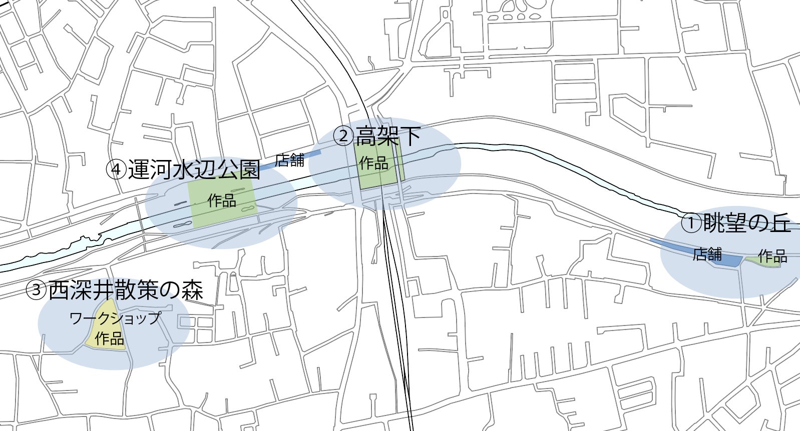 本プロジェクトでは①眺望の丘、②高架下、③西深井散策の森、④運河水辺公園の順番で4つの豊かな場所を劇場にデザインします。