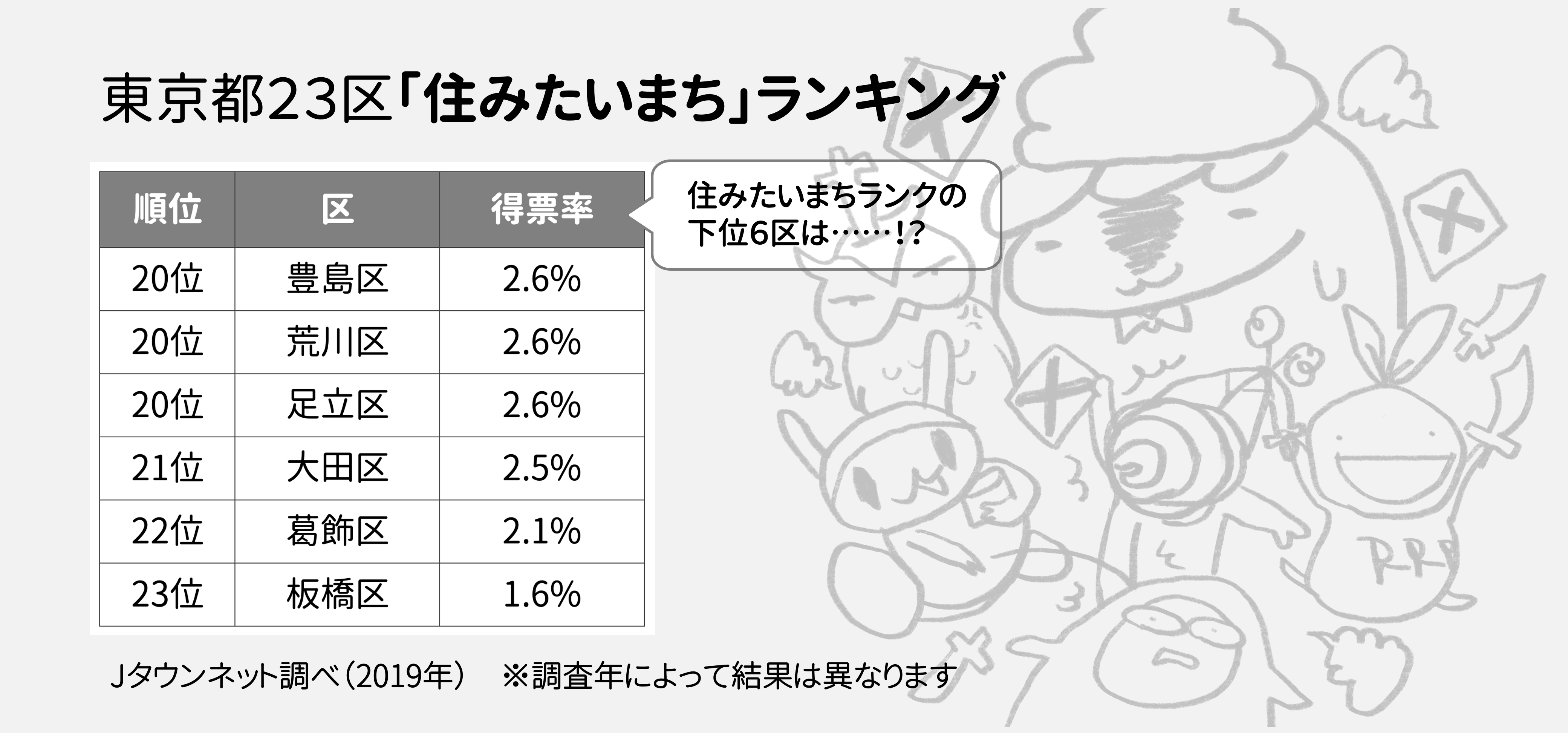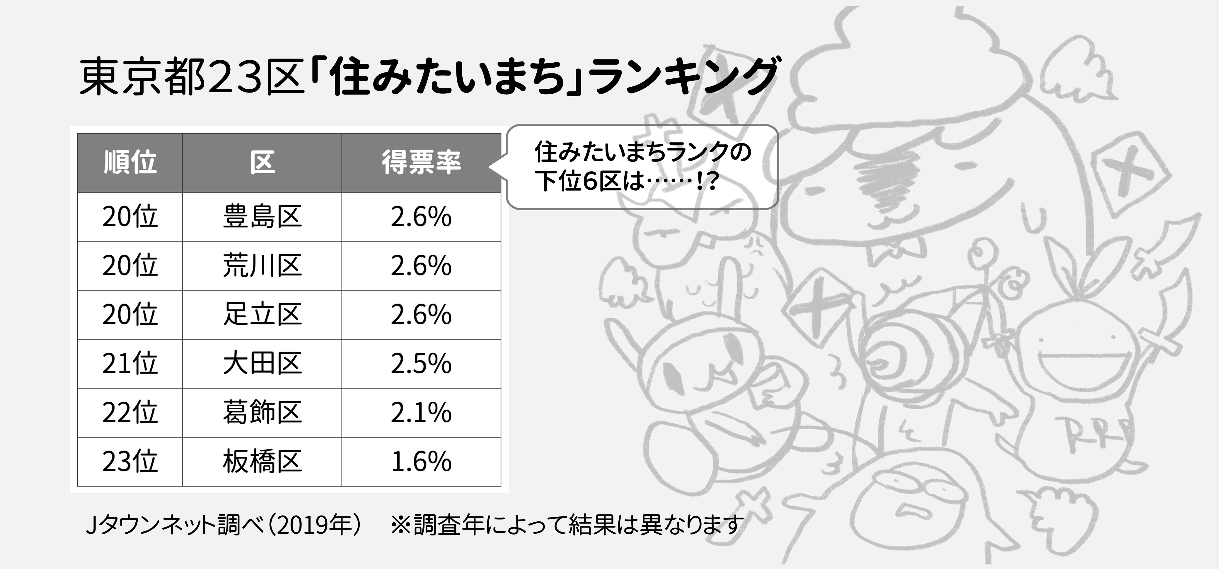 本作「住みたくないまちMATCH」は東京23区の「住みたいまちランキング(Jタウンネット2019年調査)」で無念にも最下位になってしまった板橋区をはじめ、最下層6区が互いの汚点を押しつけあうゲームです。