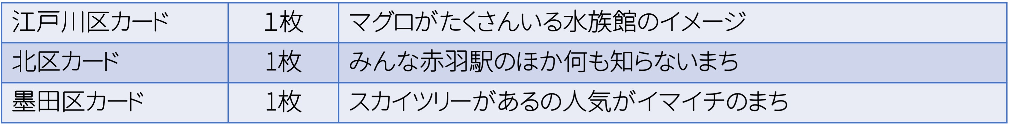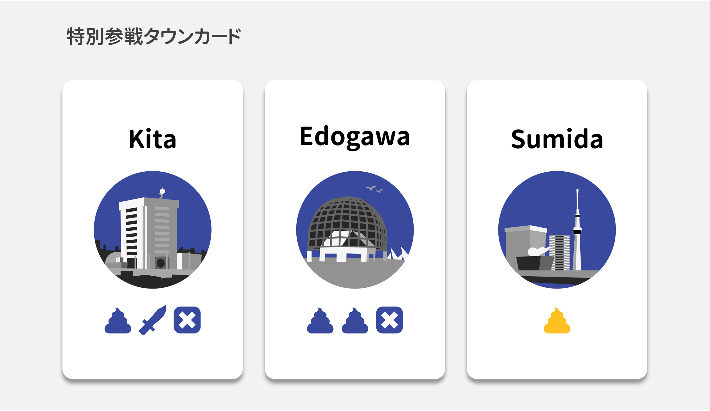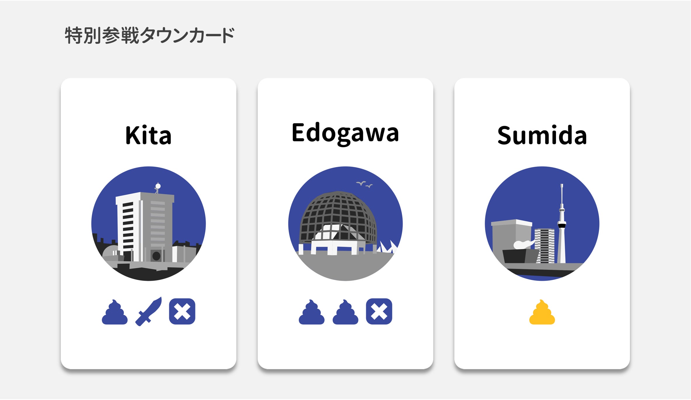 23区で「その最下位バトルに、オレたちのまちが無いのはおかしい!」という熱い声に応え、ランキング下位の常連である3区カードをつくりしました。通常のタウンカードに加えて楽しんでいただけます。