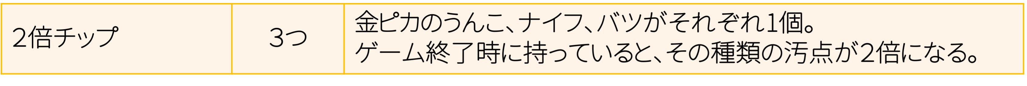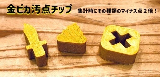 また、スペシャル汚点チップもセットで用意します。この3Dプリンターで製造したこの金ピカ汚点チップは、ゲーム終了時に所持していると、その種類の汚点チップ点数が2倍になるという特性を持っています。通常の汚点チップよりも厚みがあるため、小指の間にはさんで仕込むことも容易です。通常セットの汚点チップとあわせて自由に使ってください。