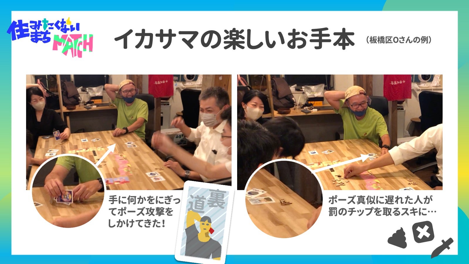 いつ、誰からイカサマされるかわからないドキドキ感。「治安が悪い○○区にみんなでナイフを押しつけよう」とか「うんこと言えば○○区」といった愛ある悪態が飛び交い、笑いながらも緊張の糸がとぎれない、濃厚なゲーム体験を味わえます。