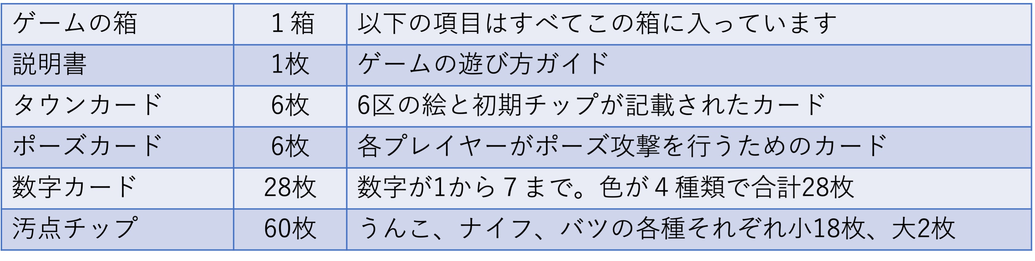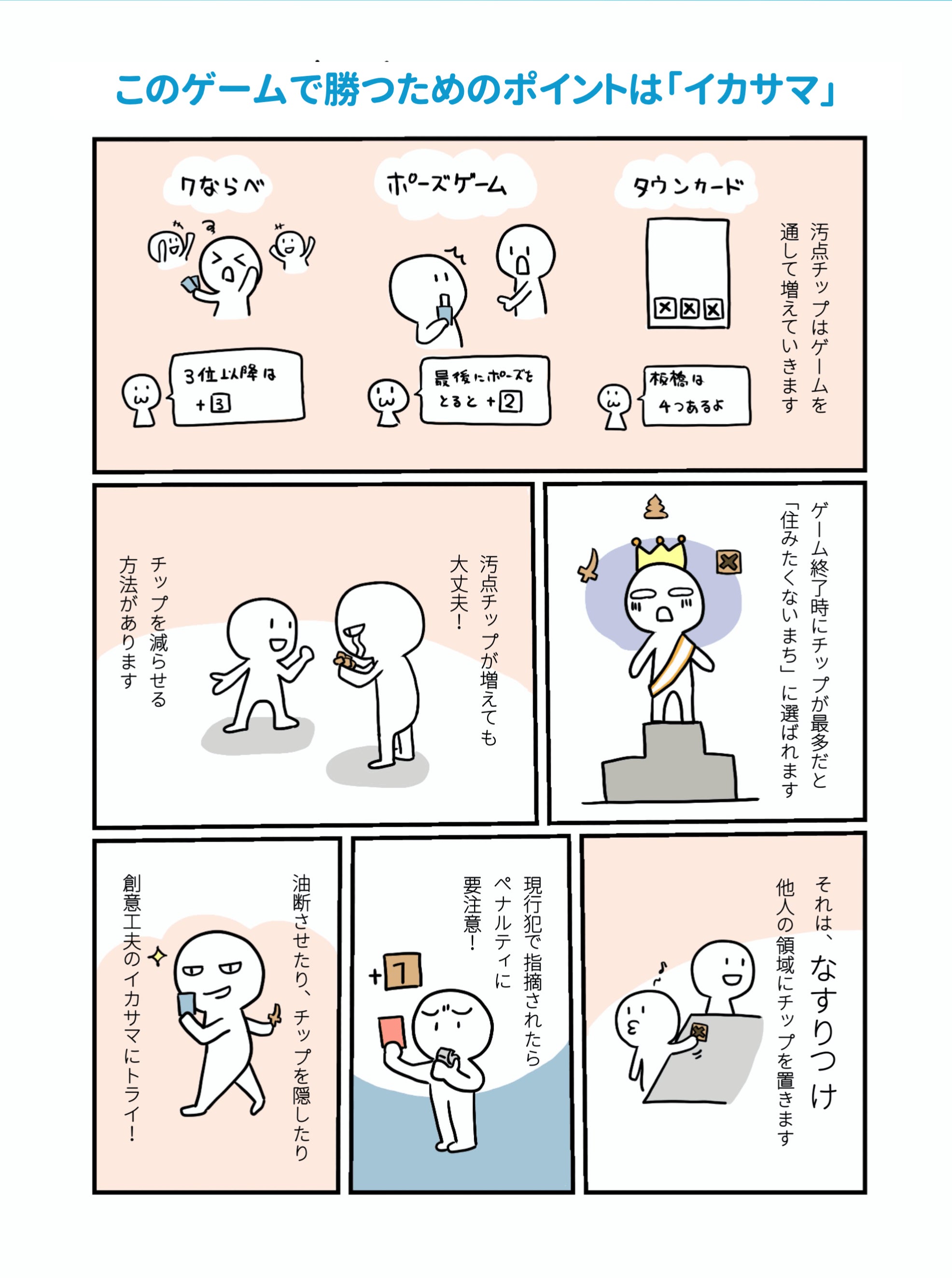 各プレイヤーはこの6区いずれかの代表となり、もっている分だけマイナス点になる「汚点チップ」をなるべく所有しないよう立ち回ります。