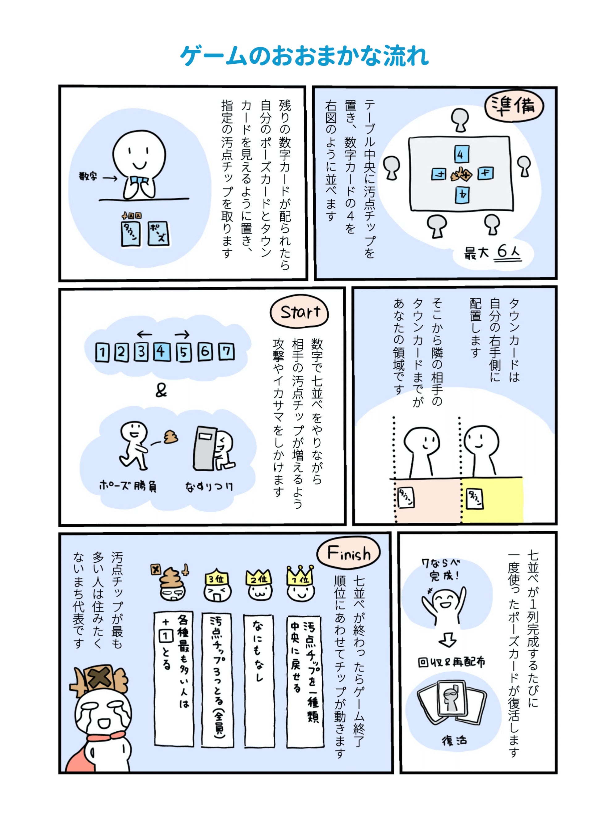 ゲームそのものはトランプの「七並べ」と同様のルールが基本でとてもシンプル。そのうえ「ポーズ攻撃」で他人のポーズを真似しなければならないという身体的なアクションのため、忙しく動き回るワチャワチャ感が生まれます。