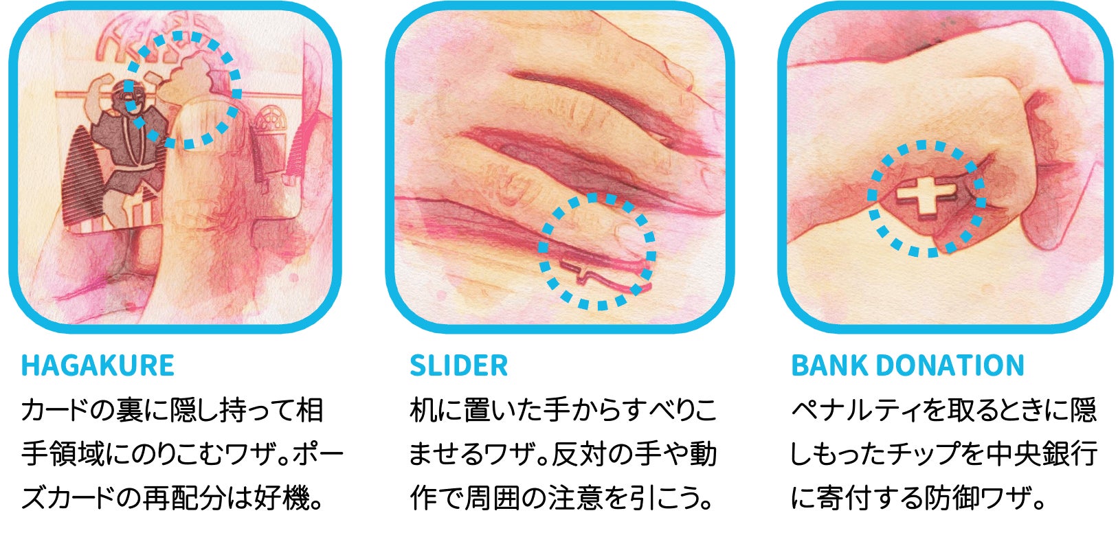 このゲームの大きな特徴は「イカサマ」の存在です。あなたが不本意にも手にしてしまった「汚点チップ」は、いつでも、他人にこっそり押しつけて渡してしまうことができます。