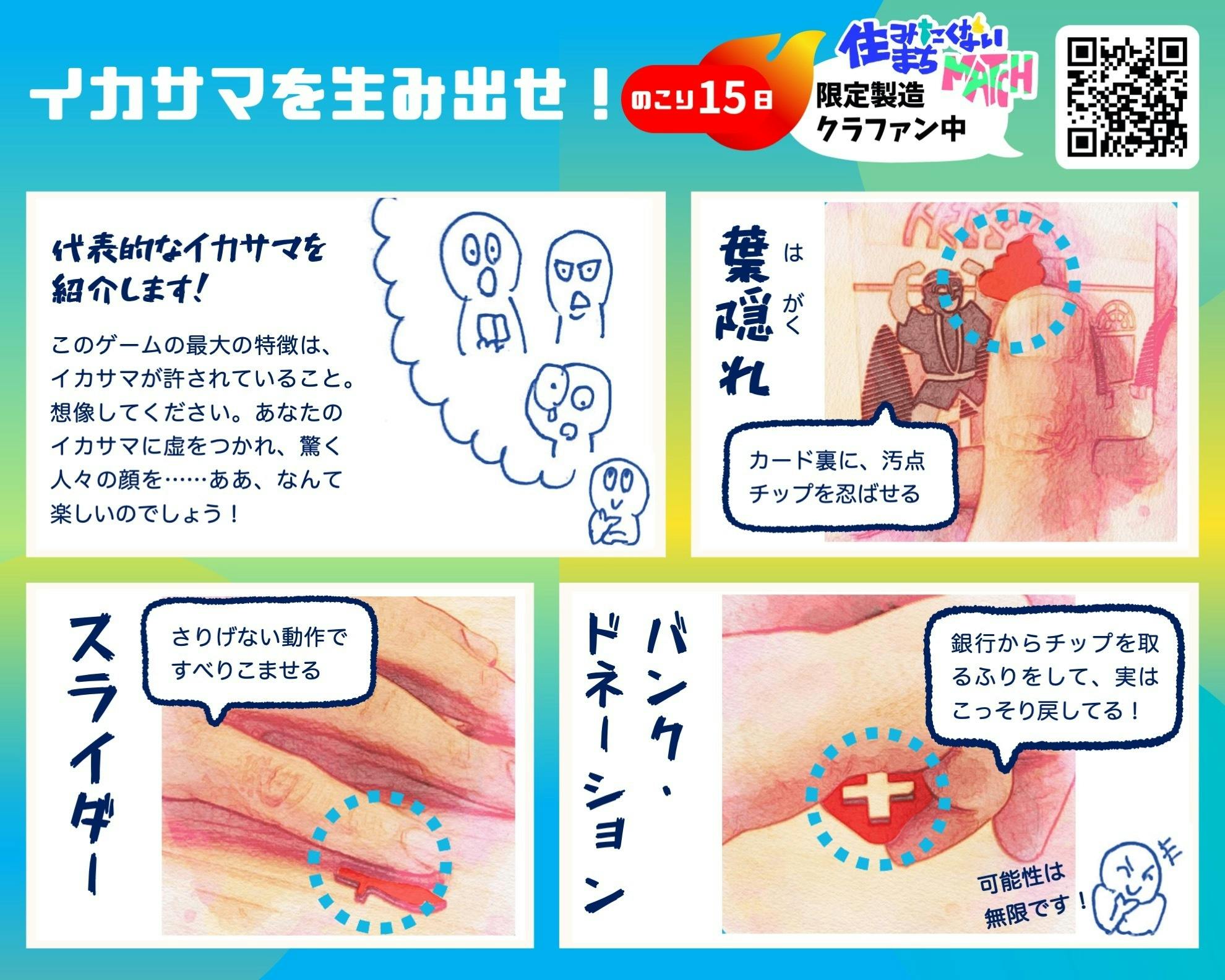 本作、「住みたくないまちMATCH」は、イカサマOKという破天荒なルールが最大の特徴です。もちろん、イカサマは現行犯を指摘されるとペナルティがあります。でも、ポーズカードの混乱などに乗じて、あるいは他のプレイヤーがイカサマを決めて盛り上がっている空気にあわせ、さまざまな場面を積極的に狙っていきましょう!