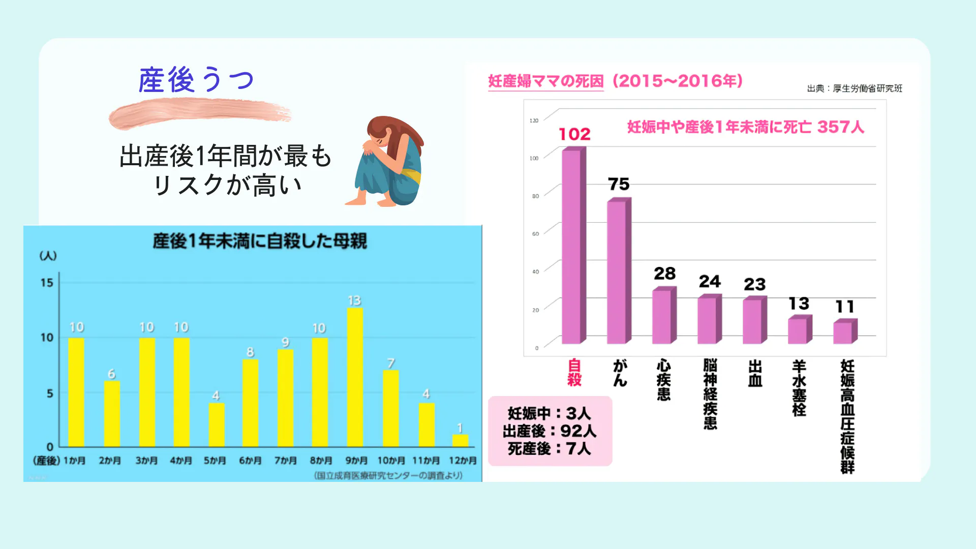 ショッキングな事実ですが、妊娠中から産後1年間のうちに死亡した女性の死因第一位は自殺とされています。