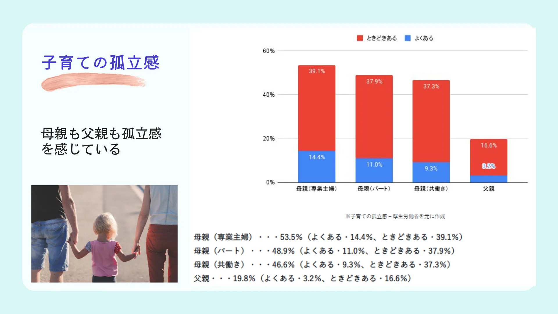 さらに、現在のコロナ禍により、母親だけでなく父親も子育てにおいて孤立感を抱えていることもわかっています。