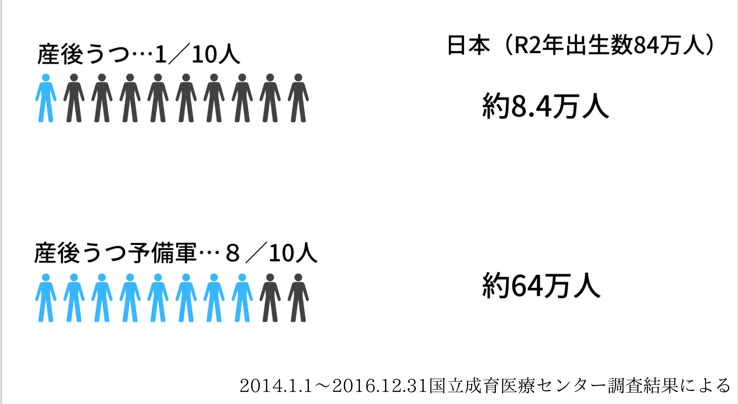 これには産後うつが大きく関与しています。10人に1人が産後うつを発症し、10人に8人がその予備軍といわれています。