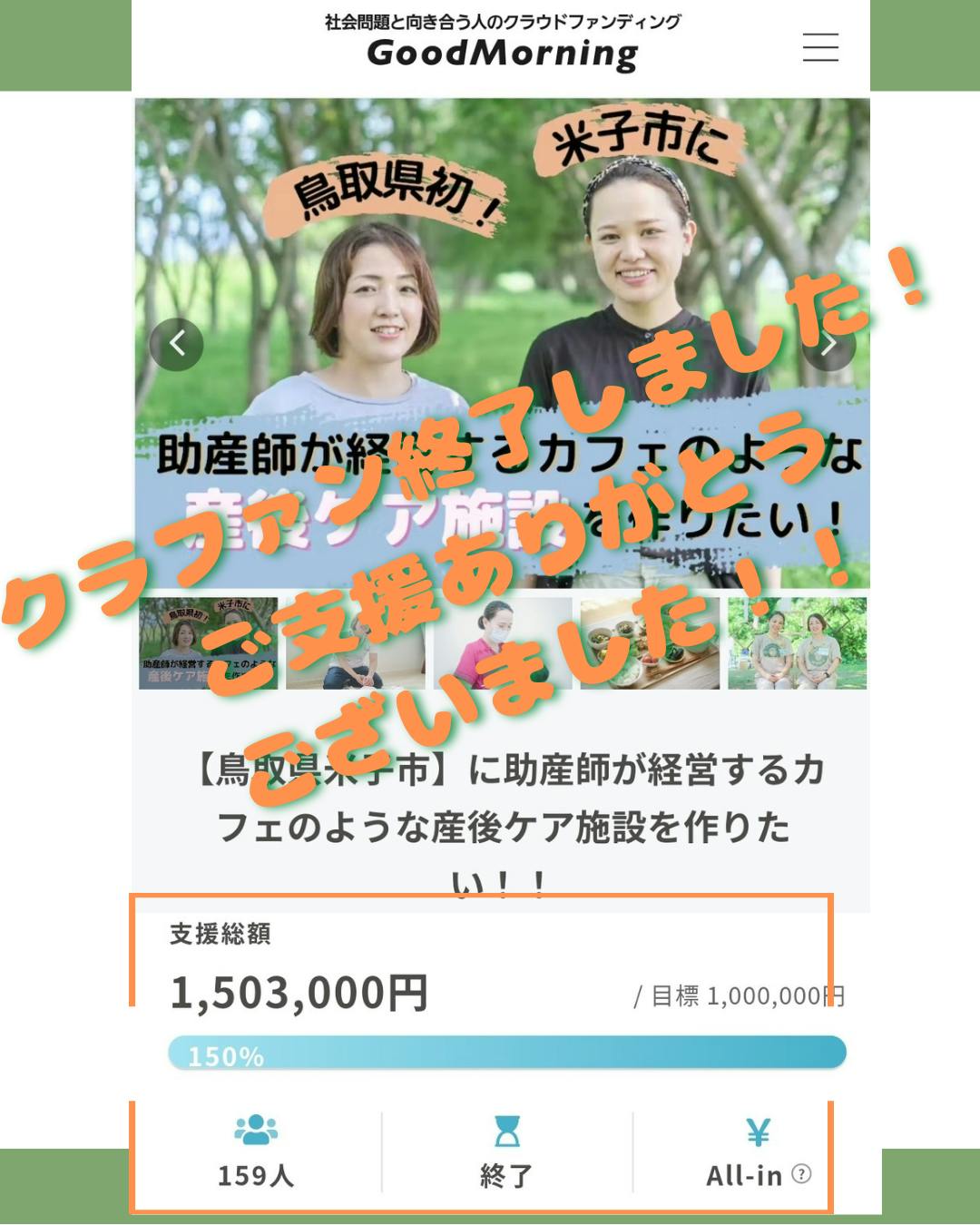 2023/02/03 09:21クラファン終了しました!ご支援いただき、ありがとうございました!!早いもので2月です。クラウドファンディングのご報告とお礼のご挨拶が遅くなってしまいました。昨年12月3日から開始したクラウドファンディング、無事に1月31日にプロジェクト終了しました!ご支援いただいた皆様なんと159名((T_T))当初の目標を大きく超え、1503000円のご支援をいただきました!!本当にありがとうございました。まだ実際には始まっていない事業にこんなにもご支援いただけたこと、応援のメッセージ、本当に励みになりました。はぐはぐをご利用予定の妊婦さんや産後の方々、ご主人さんからもお申し込みいただきました。私たちに関係してくださっている方々の他にも、ただ事業を応援していますとご支援いただいた方々も多く、感謝感謝です。いただいたご支援と応援メッセージを受けて、産後ケアの必要性を改めて感じていますし、皆様の期待にお応えできるように、準備を進めていきたいと思います。チラシ配りにご協力くださった方々、チラシを置かせていただいた店舗様ありがとうございました。リターンの準備をしますので、商品のお届けやリターンの調整は3月以降に順次ご案内します。今後ともはぐはぐをよろしくお願いいたします。 もっと見る