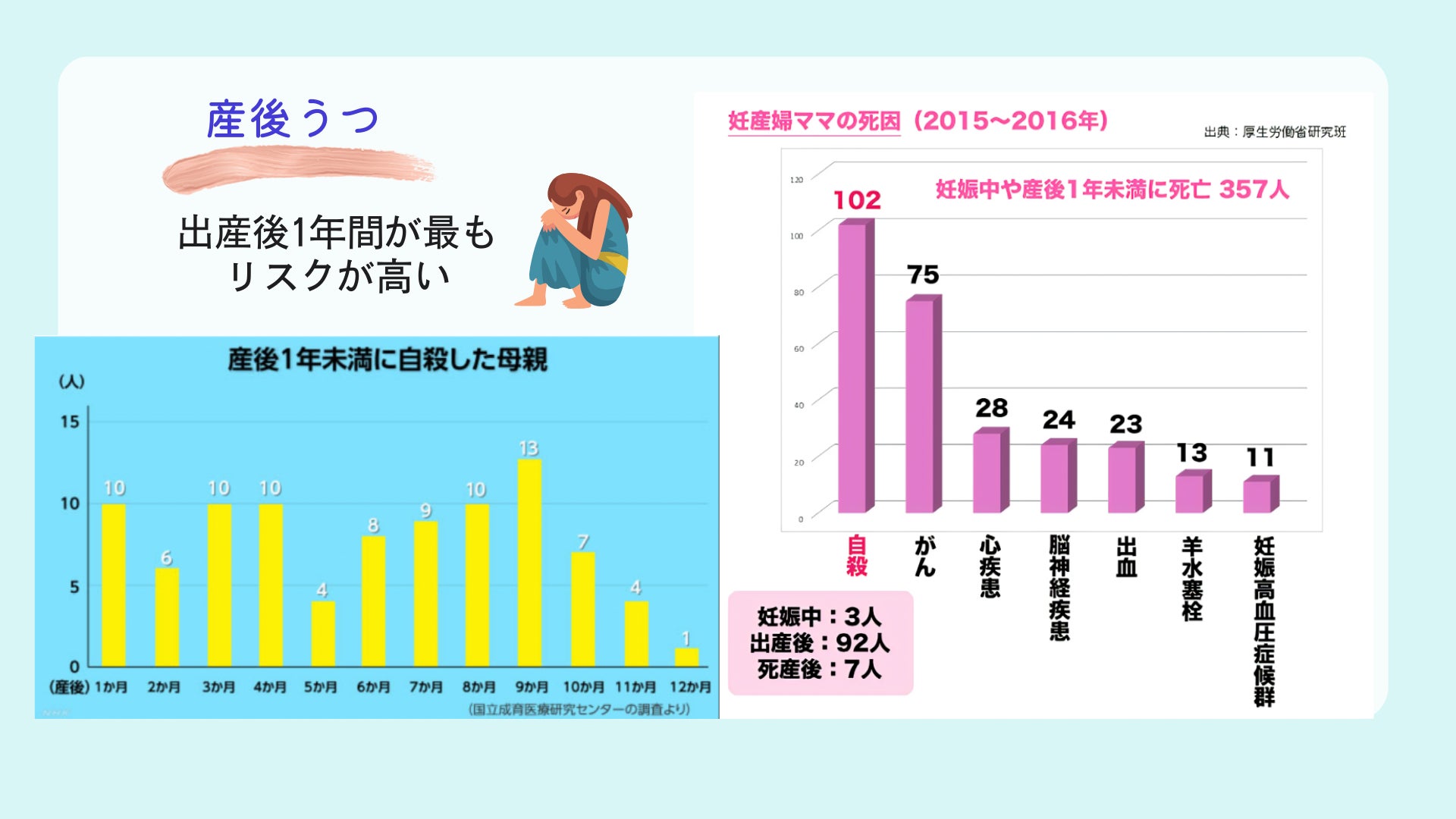 ショッキングな事実ですが、妊娠中から産後1年間のうちに死亡した女性の死因第一位は自殺とされています。