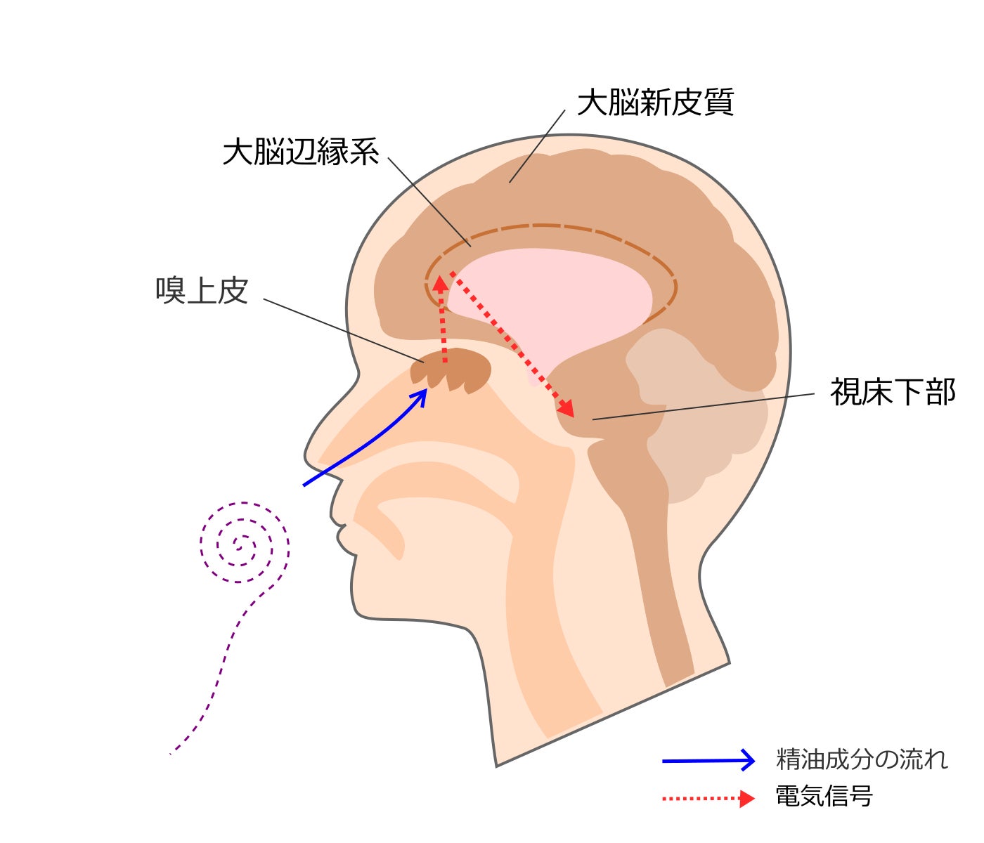 ここでは嗅覚の特性について触れていきます。「嗅覚」で感知した刺激は五感の中で唯一、感情や本能に関わる「大脳辺縁系」に直接伝達されると言われています。その速度は約0.2秒。一方でその他の五感刺激は思考を司る「大脳新皮質」を経由していきます。