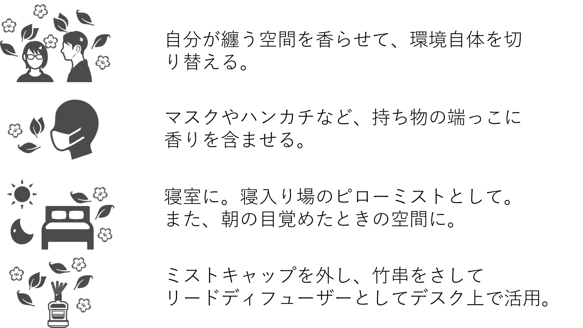 それぞれのライフスタイルに合わせて、香りの楽しみ方は沢山。アナタに合った形でご使用ください♪