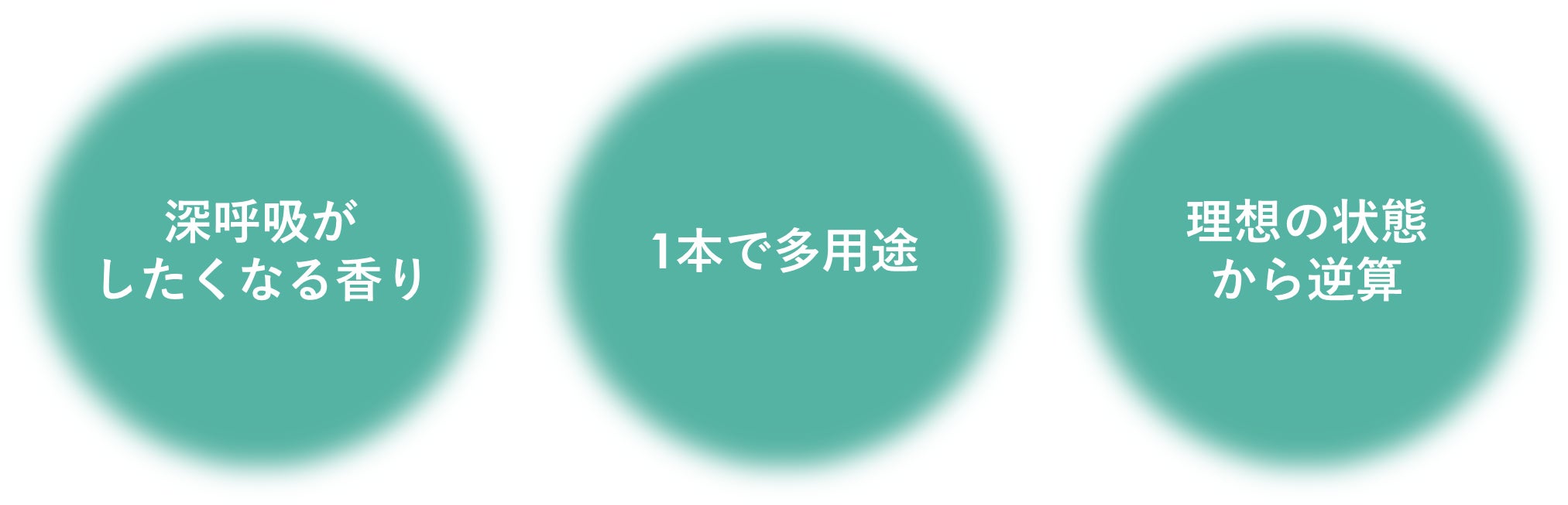 1つの香りにつき10種類〜13種類の植物性香料(精油)が使われています。それはまるで手のひらサイズの自然。思わず深呼吸がしたくなるような香りです。日常のあらゆるシーンに馴染む調香のため1本で多様な使い方ができます。香りの商品を選ぶときに「どの香りが自分にいいのかわからない」「他者からどう思われるかがわからないから、ハードルが高い」という方は多くいらっしゃいます。しかし、ここでは掲げる「理想の状態」をもとに、自分のために香りを扱うことを推奨しているので悩む必要はありません。