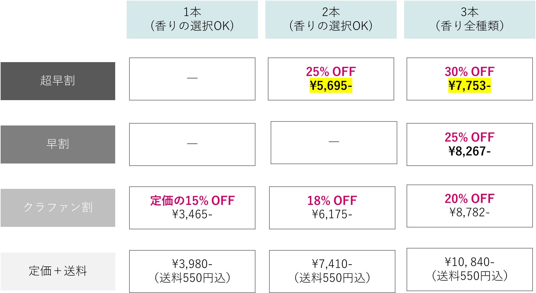 フレグランスについては、本数、香りの選択ができます。ただし、3本をお選びの方はすべての香りをお送りいたします。