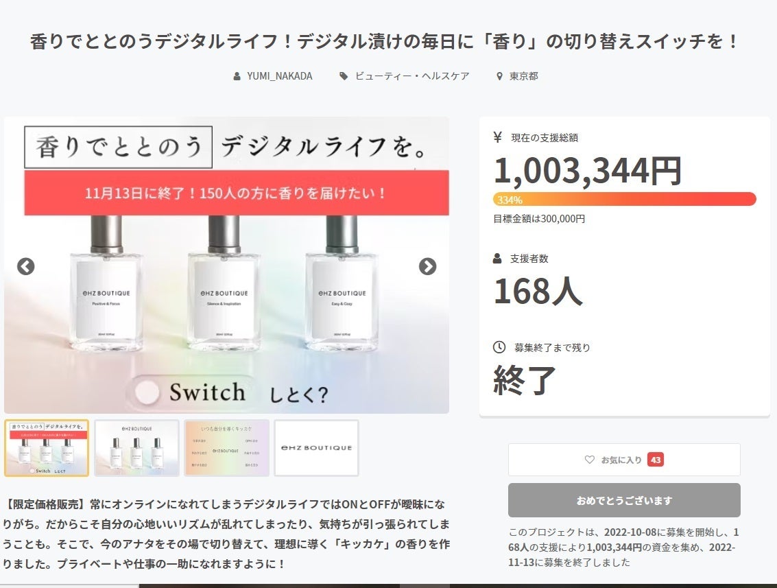 2022/11/14 21:24皆様こんにちは!月曜日はいかがお過ごしでしょうか?もう11月も中旬。あっという間に2022年も終盤ですね。お陰様で11月13日にクラウドファンディングを終え、Total 168名の方に応援いただくことができました。無名のブランドの嗅いだことも無い香りに対し、ここまで多くの方にサポートいただけるのはとてもありがたいことです。皆様の貴重なお時間と可処分時間をこのプロジェクトに割いてくださってありがとうございました。ご支援いただいた皆様が将来ドヤ顔に思わずなってしまうような、楽しく美しいブランドになっていけるように、今後も尽力していけたらと思っております。今後もぜひ見守っていただけますと幸いです。まずはリターンのお届け、頑張ります!!改めまして、この度はご支援をありがとうございました! もっと見る