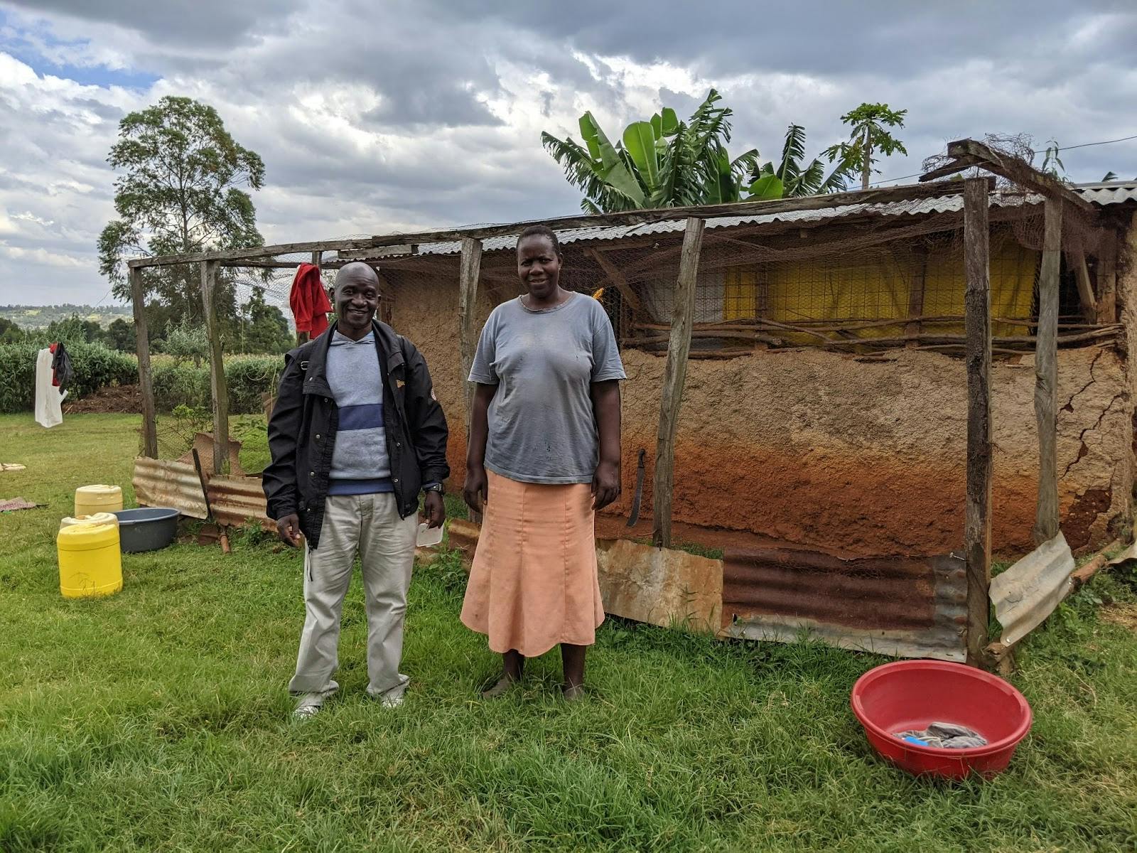 (写真:視察した過去プロジェクトの受益者と鶏舎。フェンスは破れていましたが下をトタンで補強しており、自分でメンテナンスしていました。)
