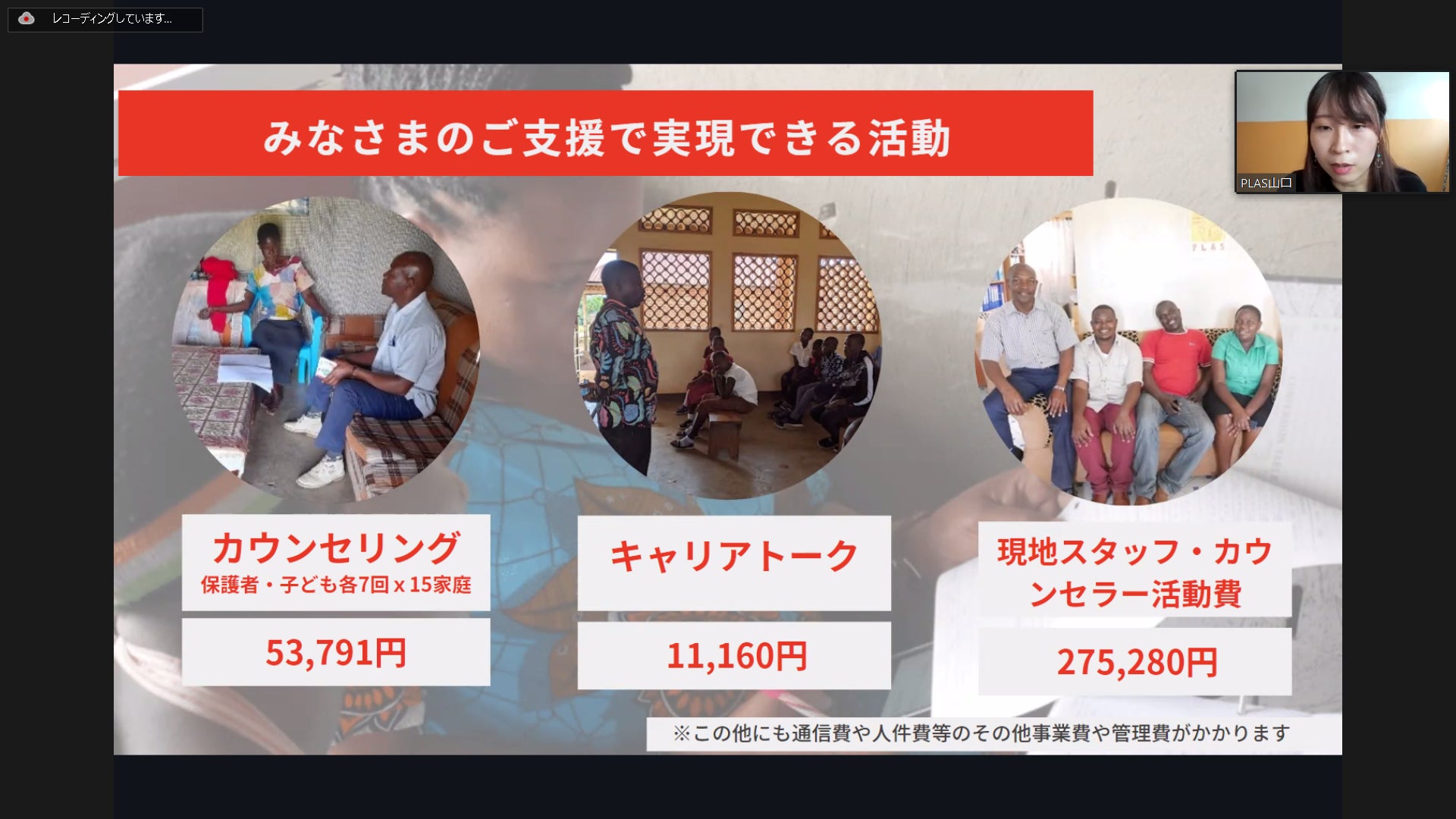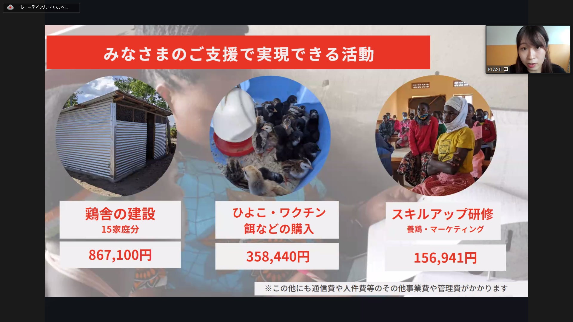 報告会では、ケニア駐在員で海外事業アシスタントマネージャーの山口より、クラウドファンディングでいただいたご支援で実施しているプロジェクト、『エイズ孤児を抱える貧困家庭の養鶏による生計向上とキャリアプランニング支援事業』の内容や進捗状況、そして現地の声をお伝えしました。