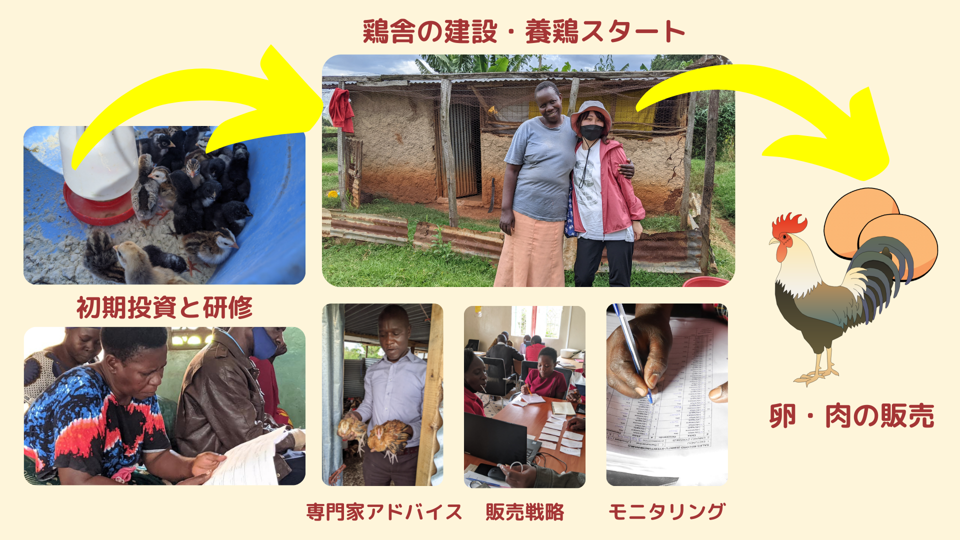 研修を受けた保護者たちはサポートを受けながら1年目に卵・肉の販売までめざします。養鶏ビジネスの支援では、保護者に養鶏研修を届け、各家庭に鶏舎をつくり、養鶏をスタートします。