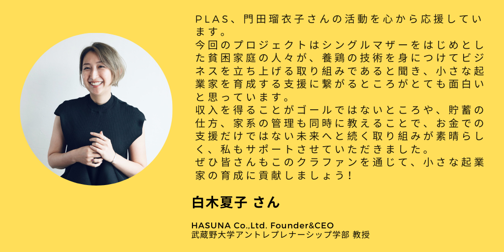 シングルマザーを中心とした保護者たちが養鶏ビジネスを立ち上げるための研修・初期投資や、養鶏ビジネスをスタートしてから自立するまでのフォローアップ費用、子どもと保護者へのキャリアカウンセリング費用、それらを担う現地パートナー団体とPLASスタッフの人件費などに大切に使わせていただきます。今回は「エイズ孤児を抱える貧困家庭の養鶏による生計向上とキャリアプランニング支援事業」のうち第一期(2022年4月~2023年4月頃まで)に必要となる資金の一部を募ります。
