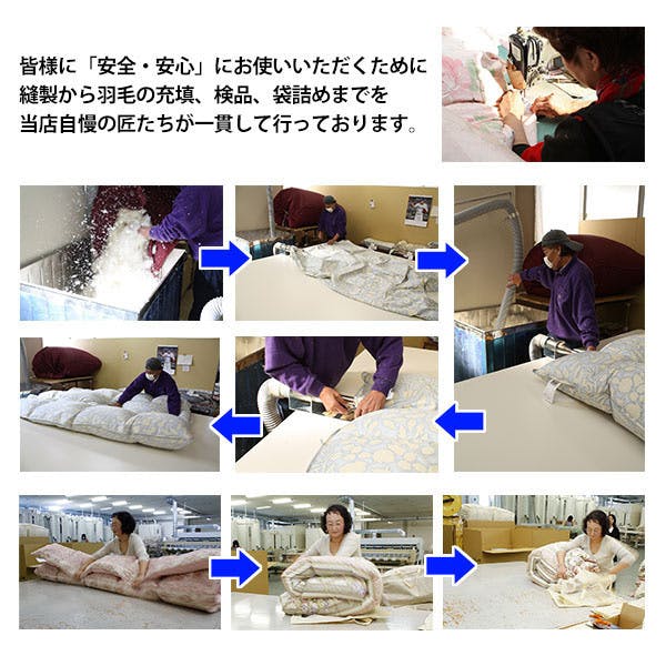 弊社では厳選された羽毛を使用し、厳しい品質管理のもとで製造され、検査に合格した羽毛布団を販売させて頂いております。万が一、製造上の不備による欠陥があった場合は、無償にて返品または交換をさせて頂きます。